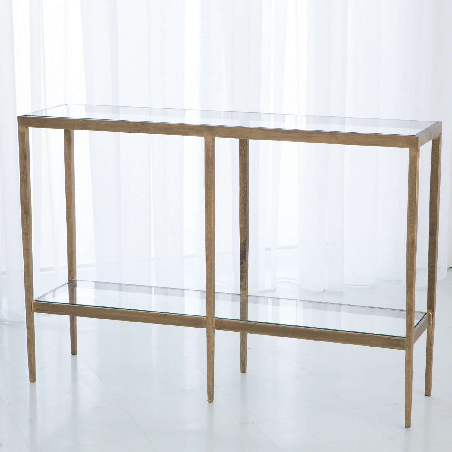 The Laforge two-tier iron console table has a clear glass top and bottom shelf. Also available in Iron & Brass Braising finish