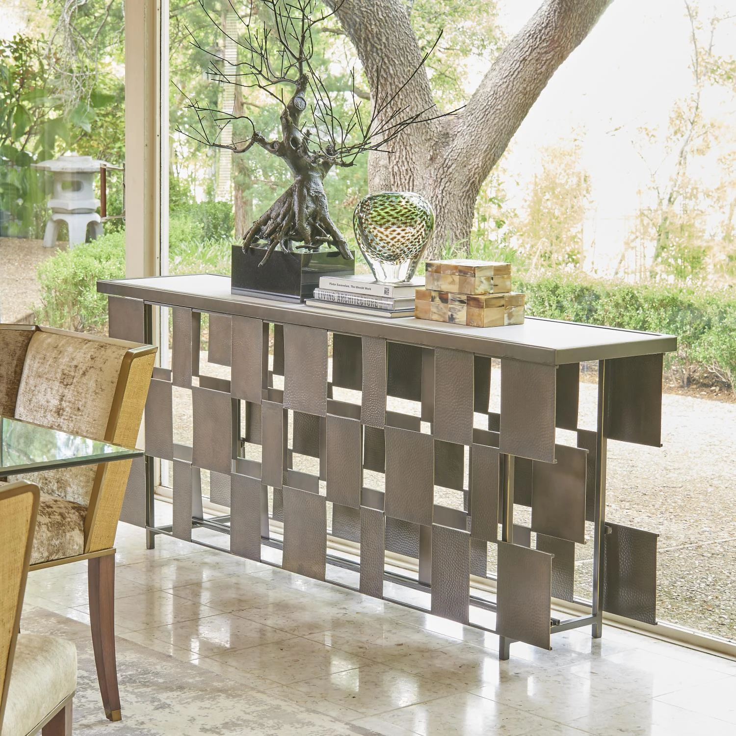Layered console constructed of alternating panels of bronze finished iron with gold accents. White honed marble top.