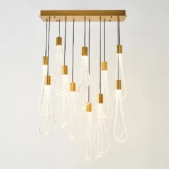 Suspended loops of soft glowing dimmable light offer a dramatic and functional accent to any environment. The LED light source located in each suspended light head interacts with air entrapped bubbles in the shaped acrylic rod to create a dramatic focal point. Individual adjustment options allow for endless configurations and the extendable cloth covered power cords with lengths of up to 6 feet permits placement above a dining room table or in a stairway entry. The perfect conversation piece for any space!