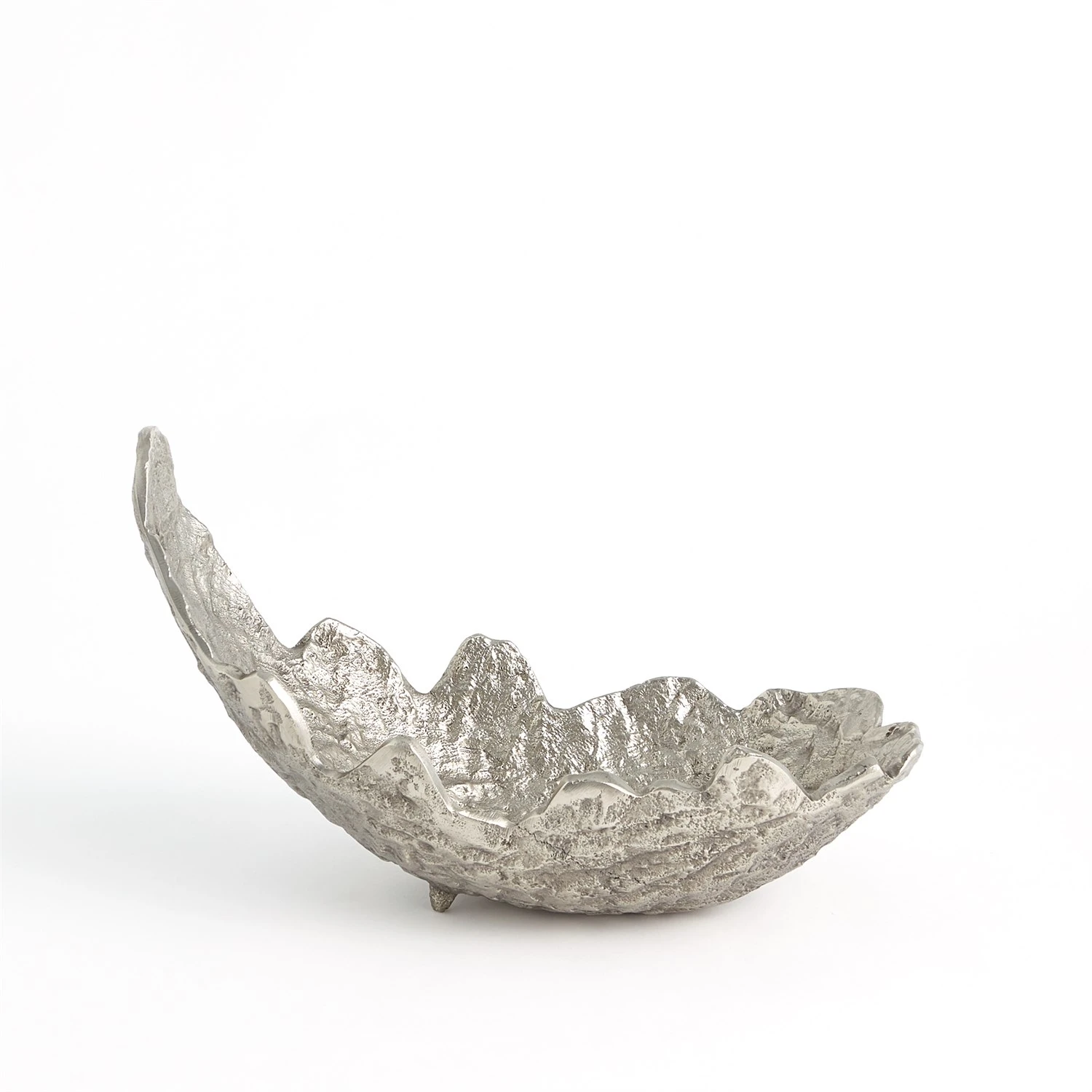 Cast aluminum in a free-form shape of a leaf with nickel finish.