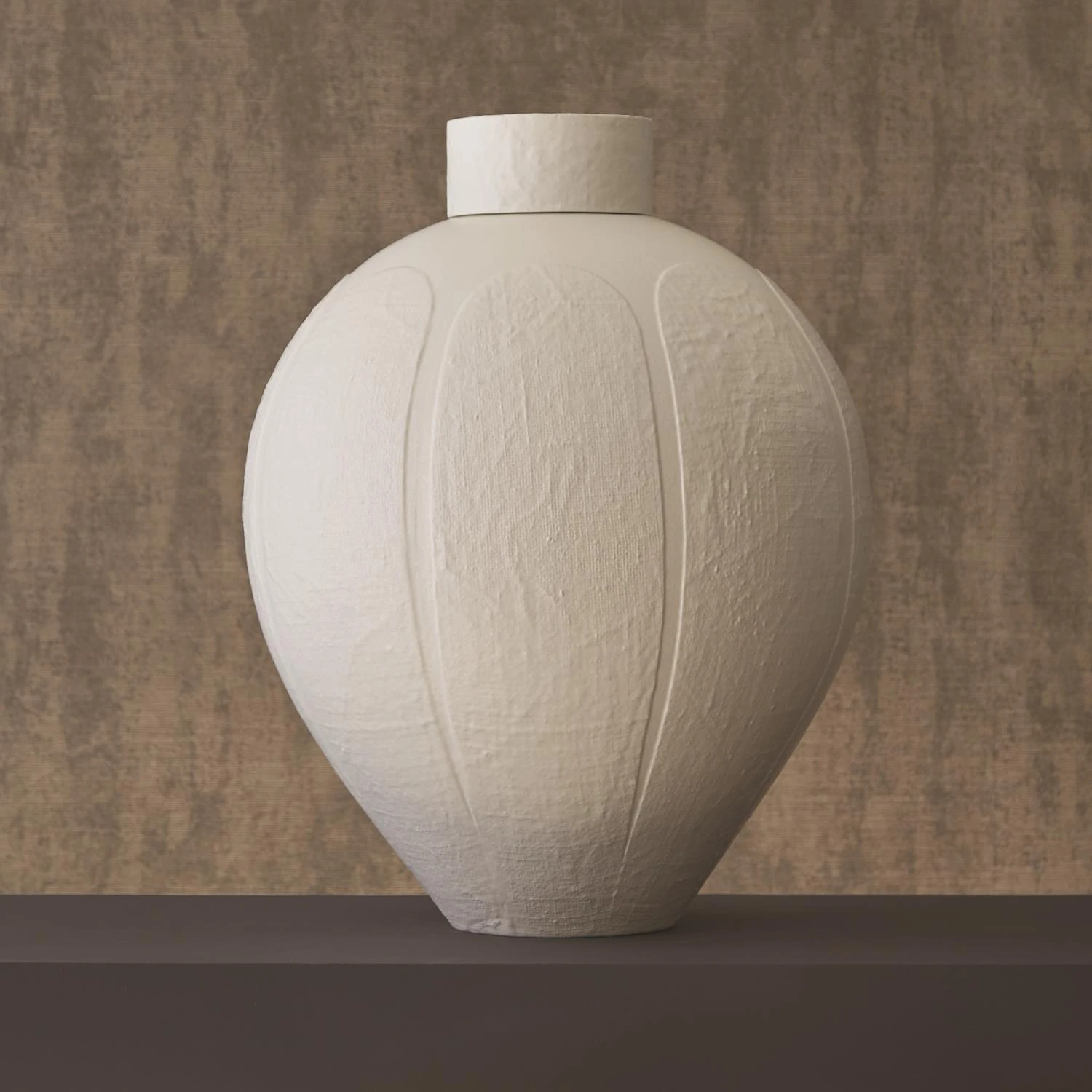 Dense, irregular texture of handwoven linen over a smooth background gives this large-scale, lidded ceramic jar lots of personality.