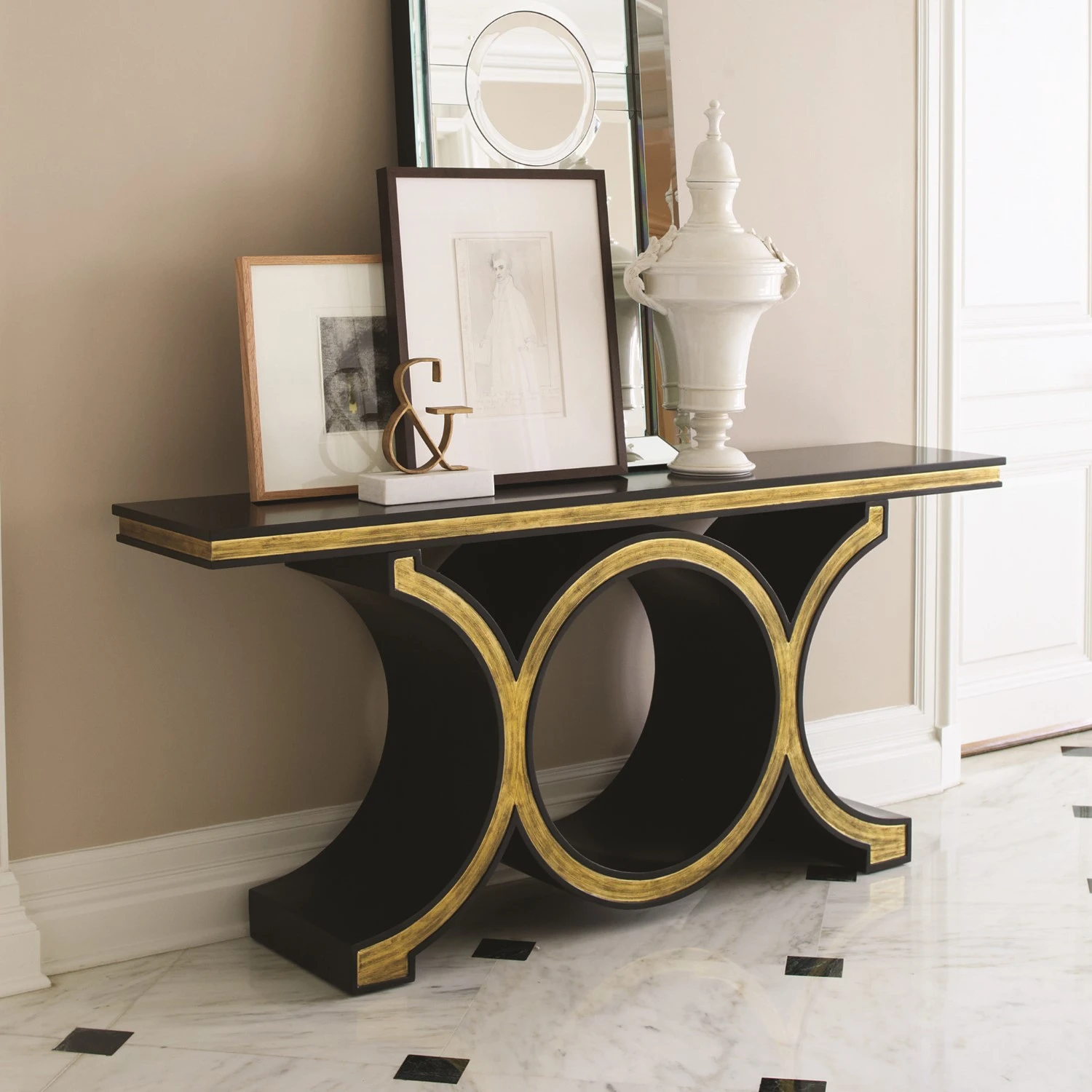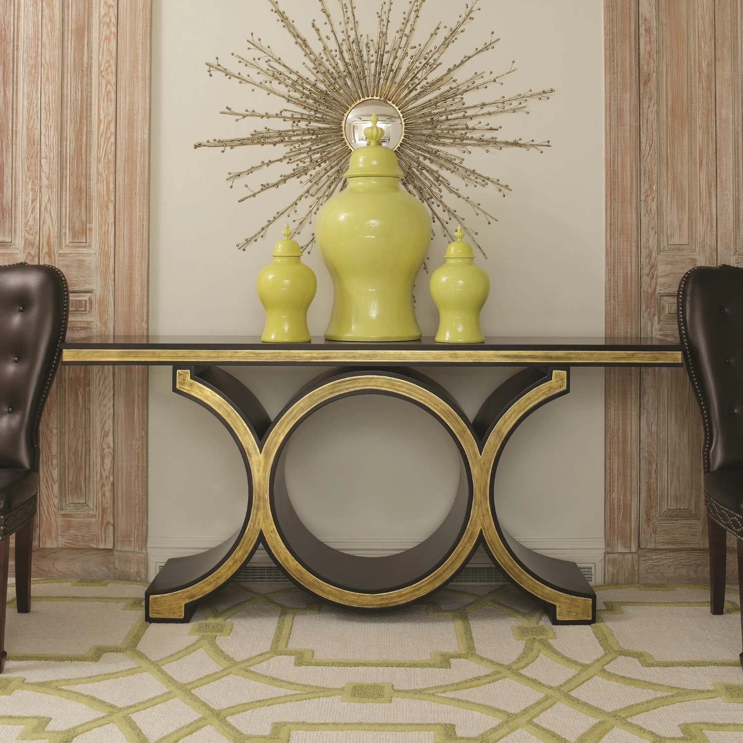 This stunning console would mix in beautifully with a traditional or contemporary environment. It is finished in satin black lacquer and gold metal leaf.