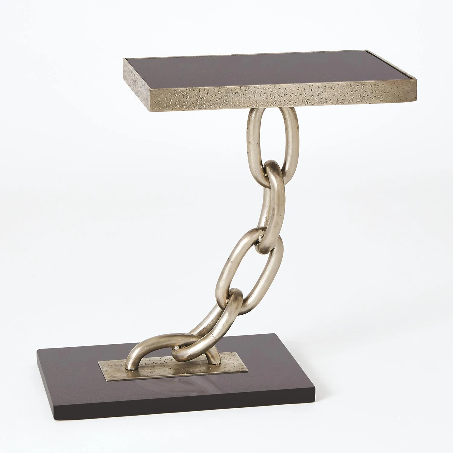 This stately piece features both a solid black marble top and base. The silver finished iron support resembles a chain that seems to be defying the law of gravity. Please note that each piece may show small variations in the antique finish applied to the iron.