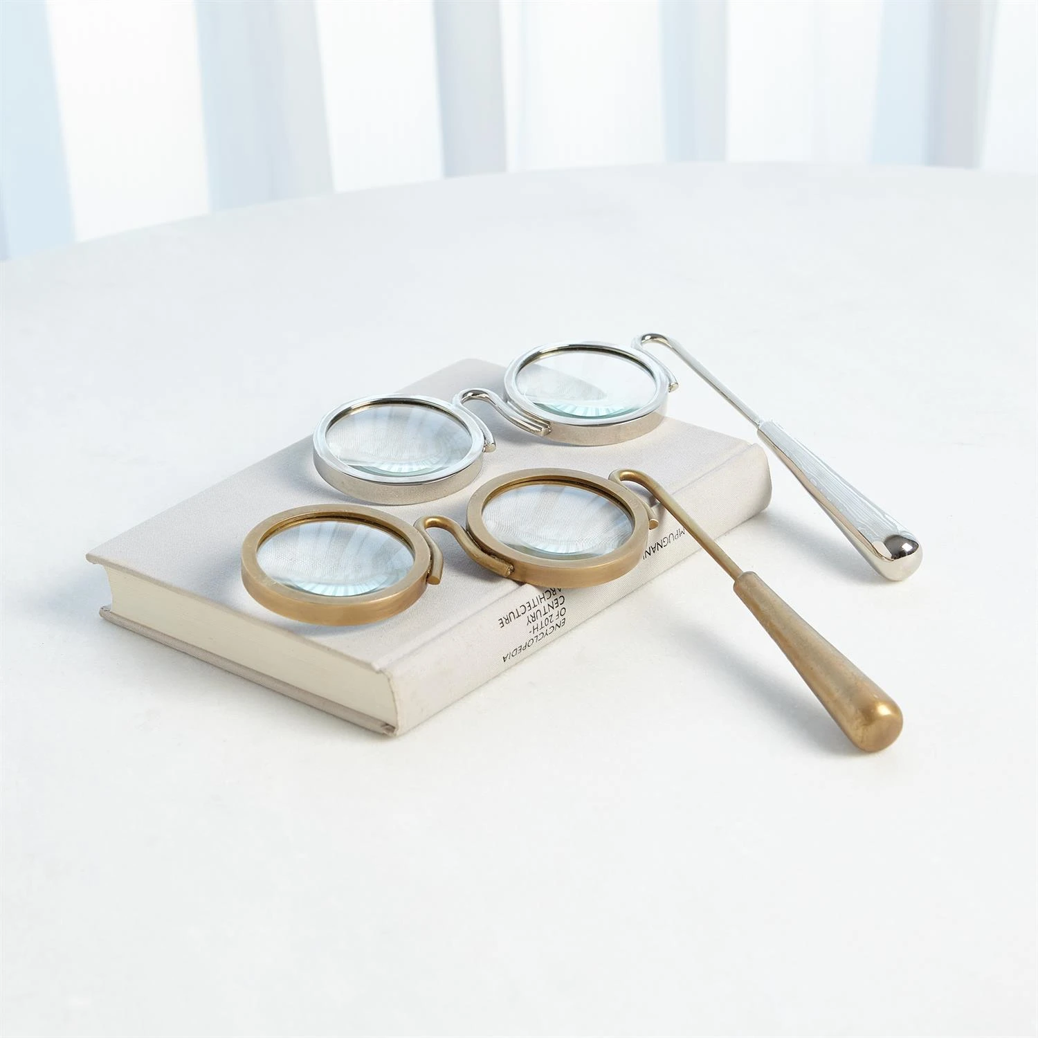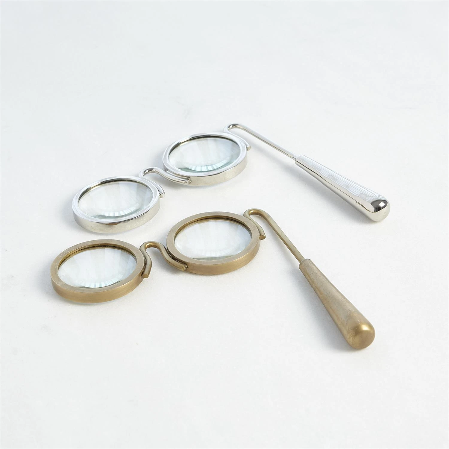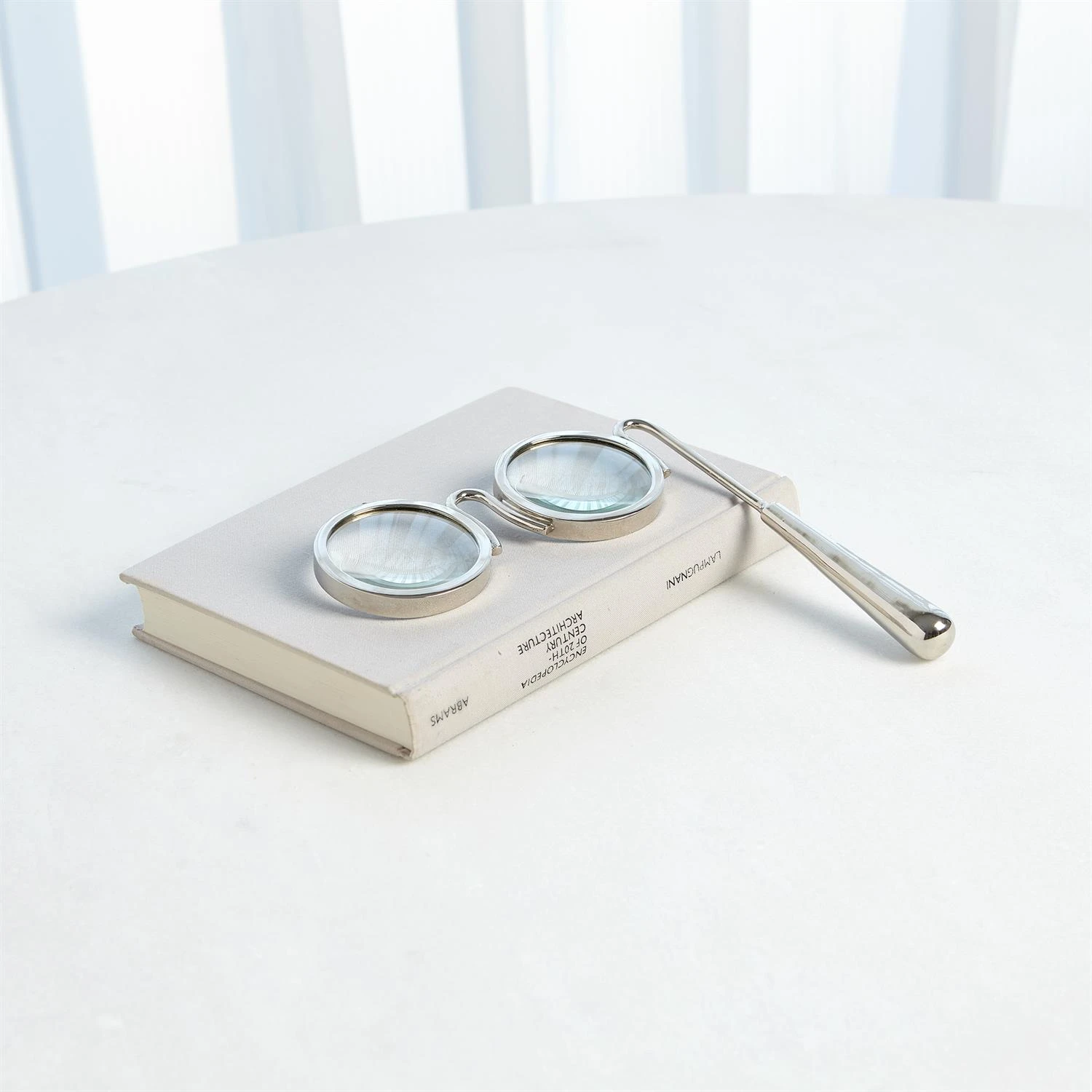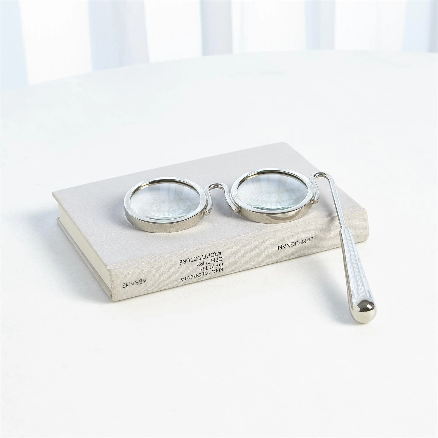 A lorgnette is a pair of spectacles with a handle used to hold them in place, rather than fitting over the ears. This whimsical pair is made of iron with a nickel plated finish. Magnifying glass piece is 2X.