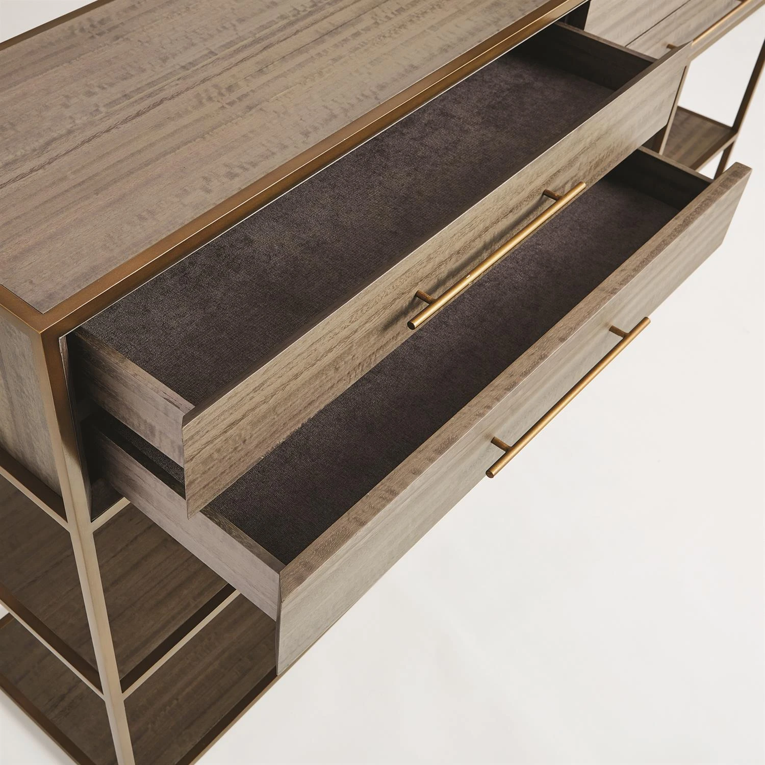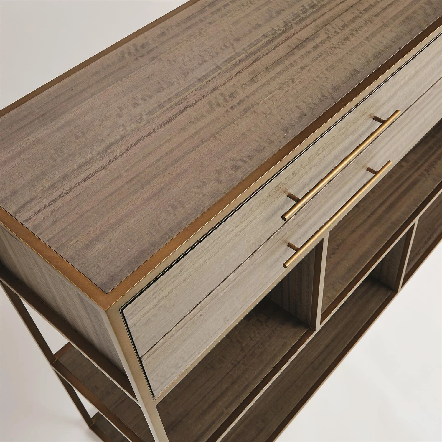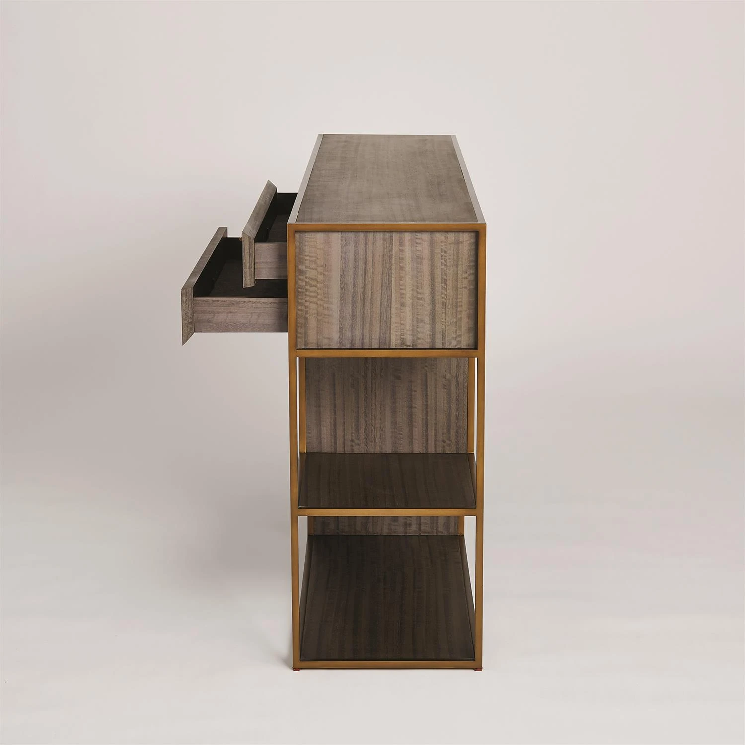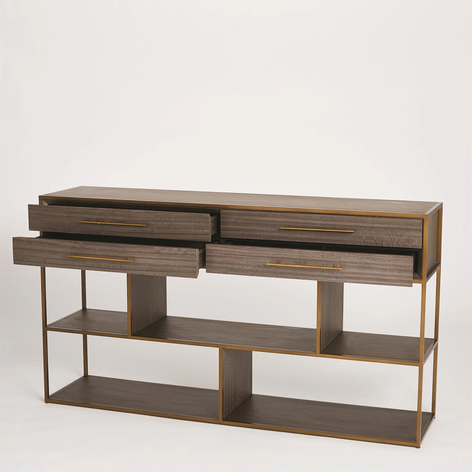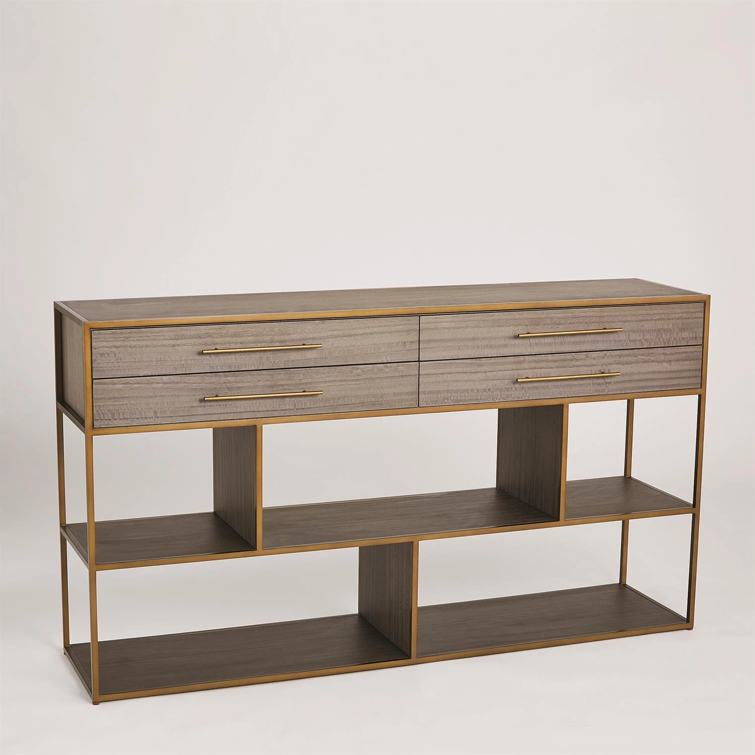 Our Mack Console features straight geometric lines embodying that of early modern design. This console features eucalyptus veneer with an antique brass finished steel frame and hardware.