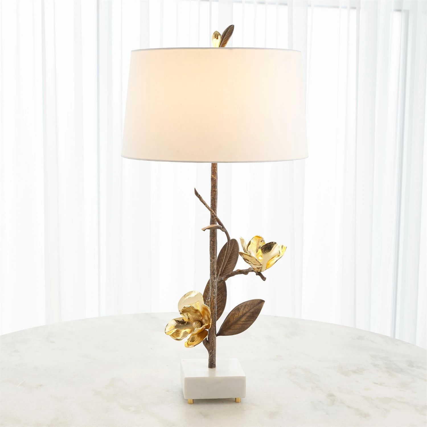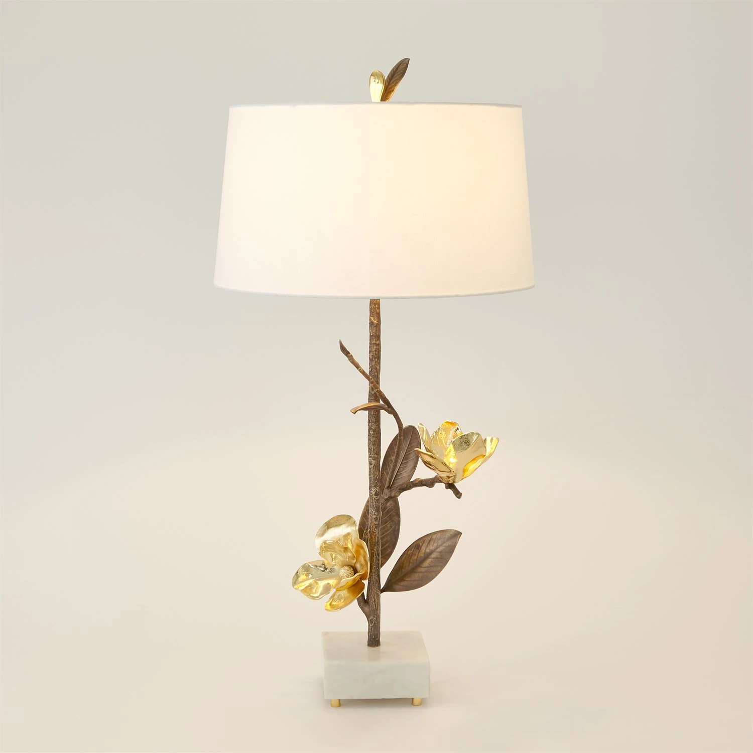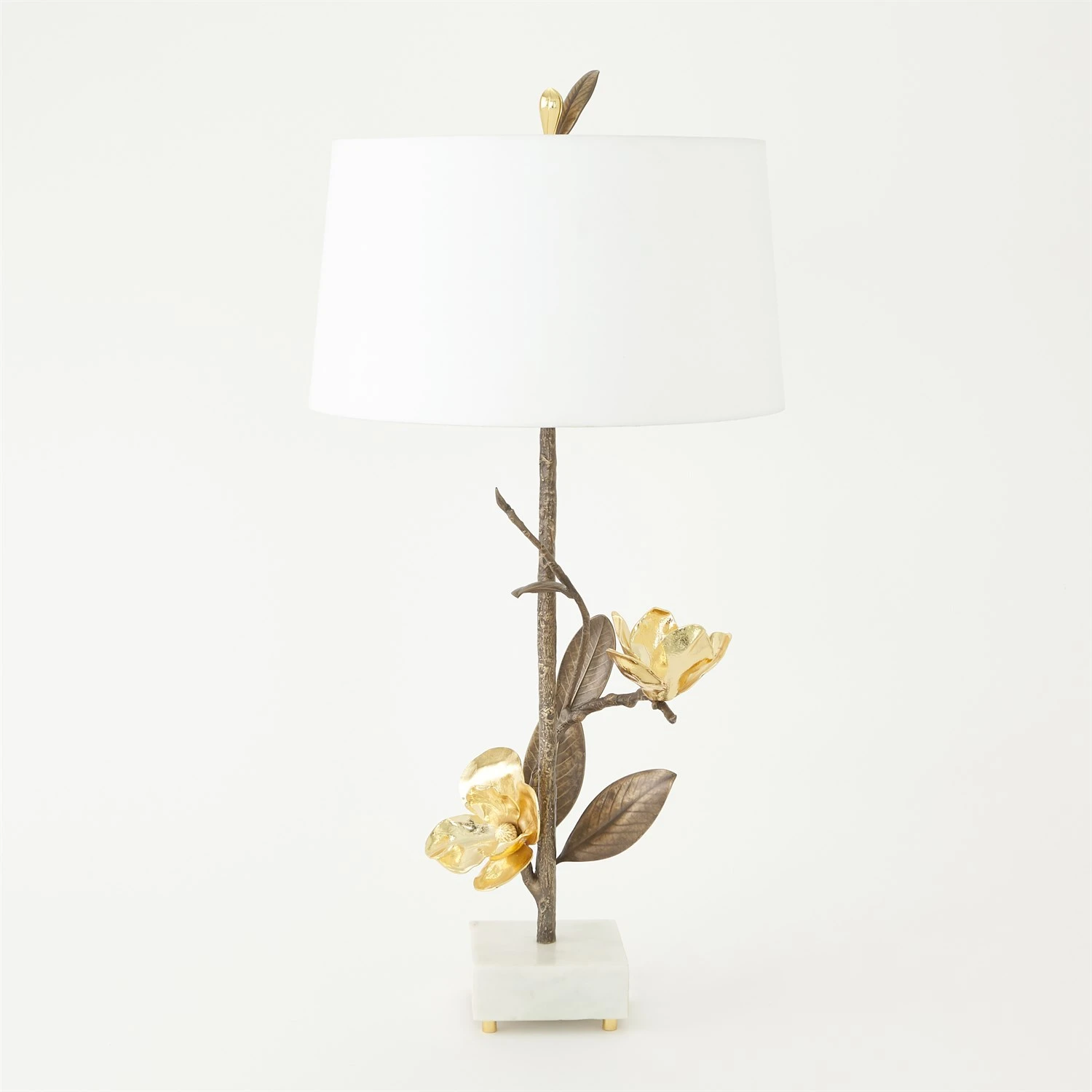 Magnolias have long been the symbol of nobility, perseverance, and love of nature. The grace and majesty of the magnolia blossom are brought to life in this extraordinary artistic lamp. The magnolia blooms are finished in highly polished brass and the stems and leaves are patinaed. Available as a left facing lamp and a companion right facing lamp. No detail is missed with this collection.