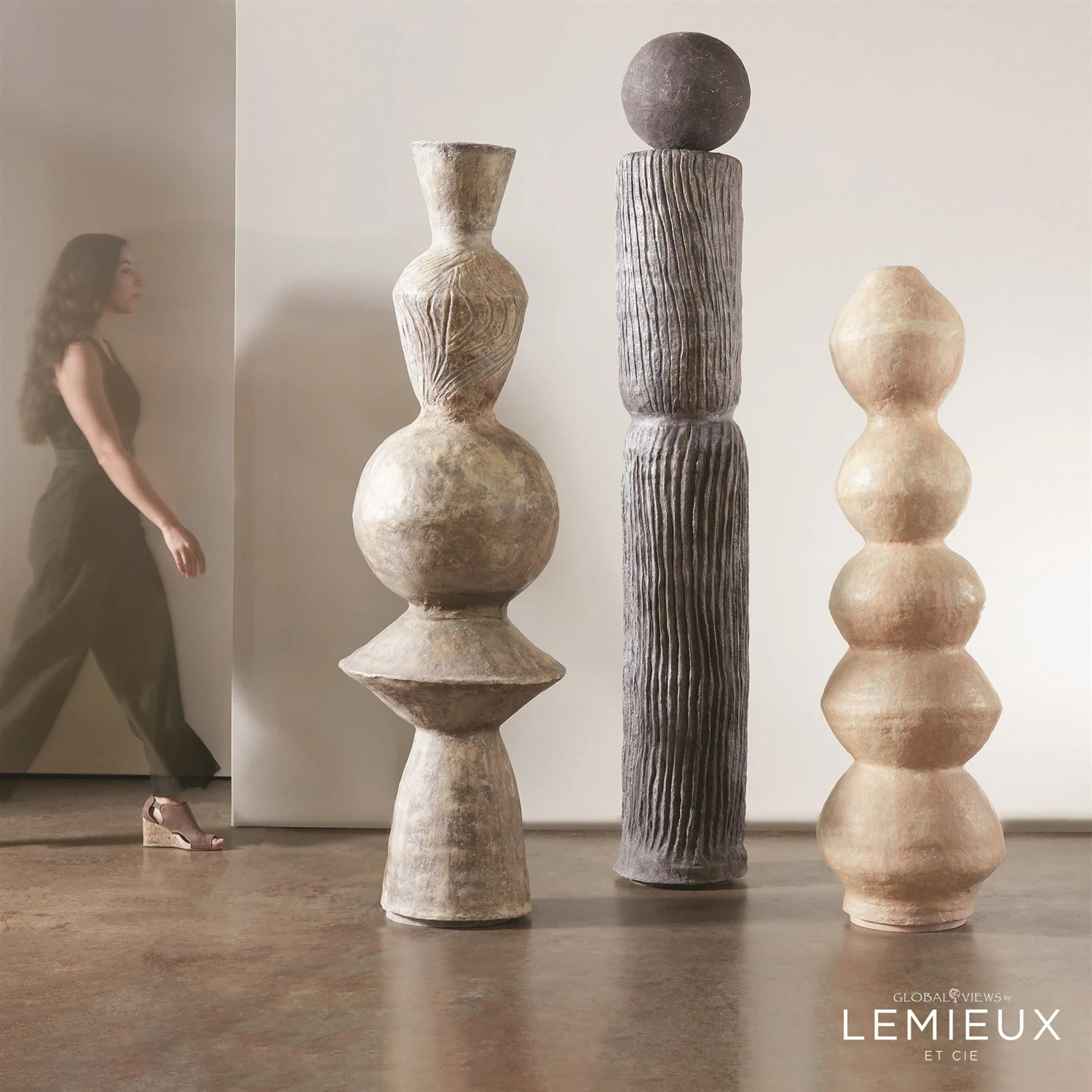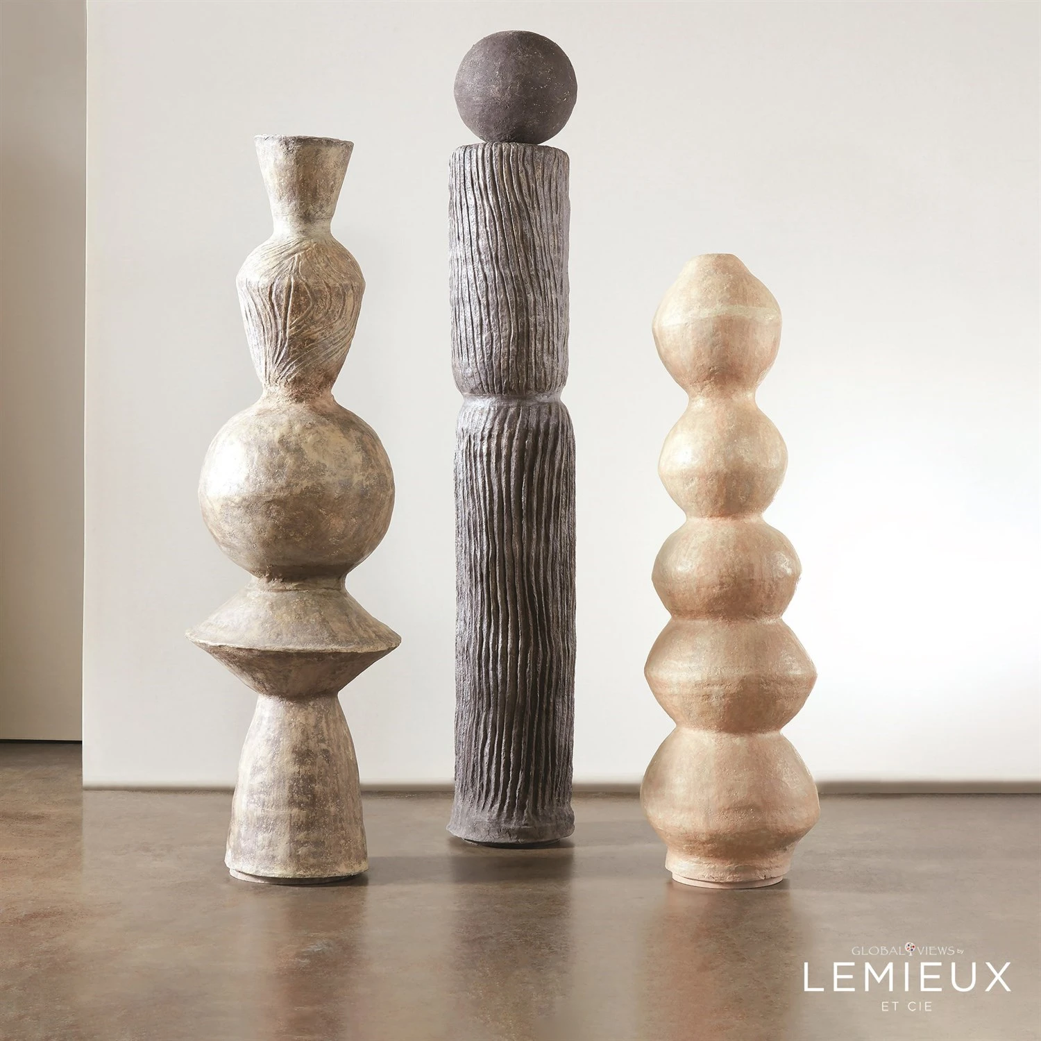 The Marcel totem is a large scale, decorative totem crafted from delicate paper mache atop a wooden base for stability. This sculptural piece will add drama and dimension to any space when used alone or in multiples. Indoor use only.