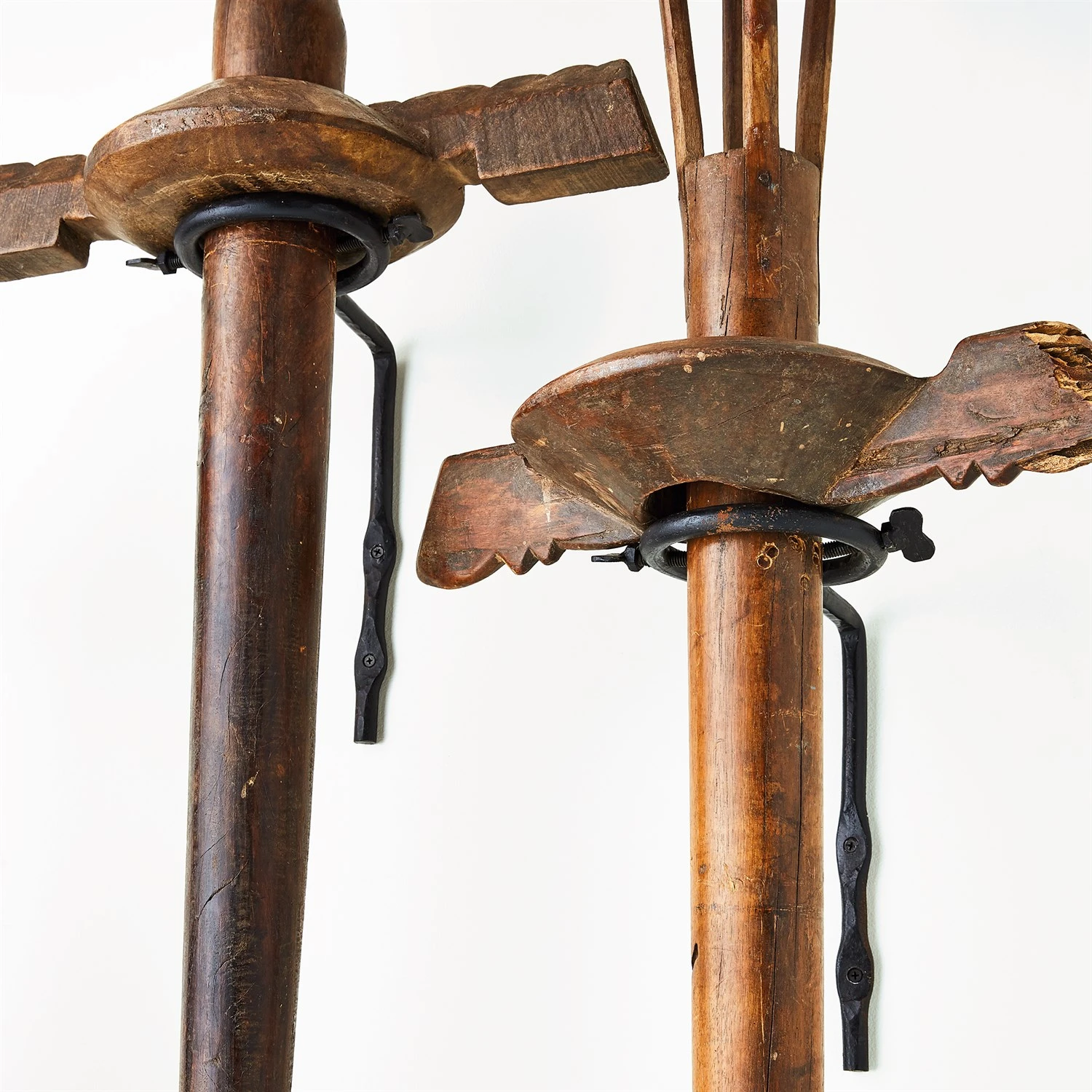 For centuries, Mathani were used to churn raw cream into butter. Electricity and automation have radically changed the use of mathani but they still are used in remote villages in India. These found objects ship with both an iron wall mount fixture and an iron floor stand.