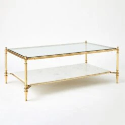 The Medford Tables feature a two-tiered design with luxurious white marble and tempered glass in a polished brass frame perfect for both entertainment and storage.