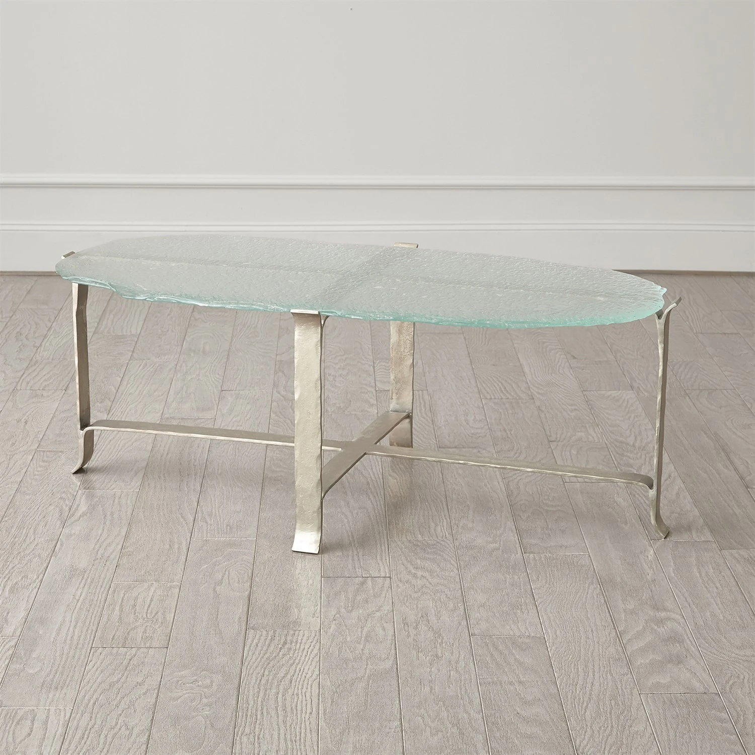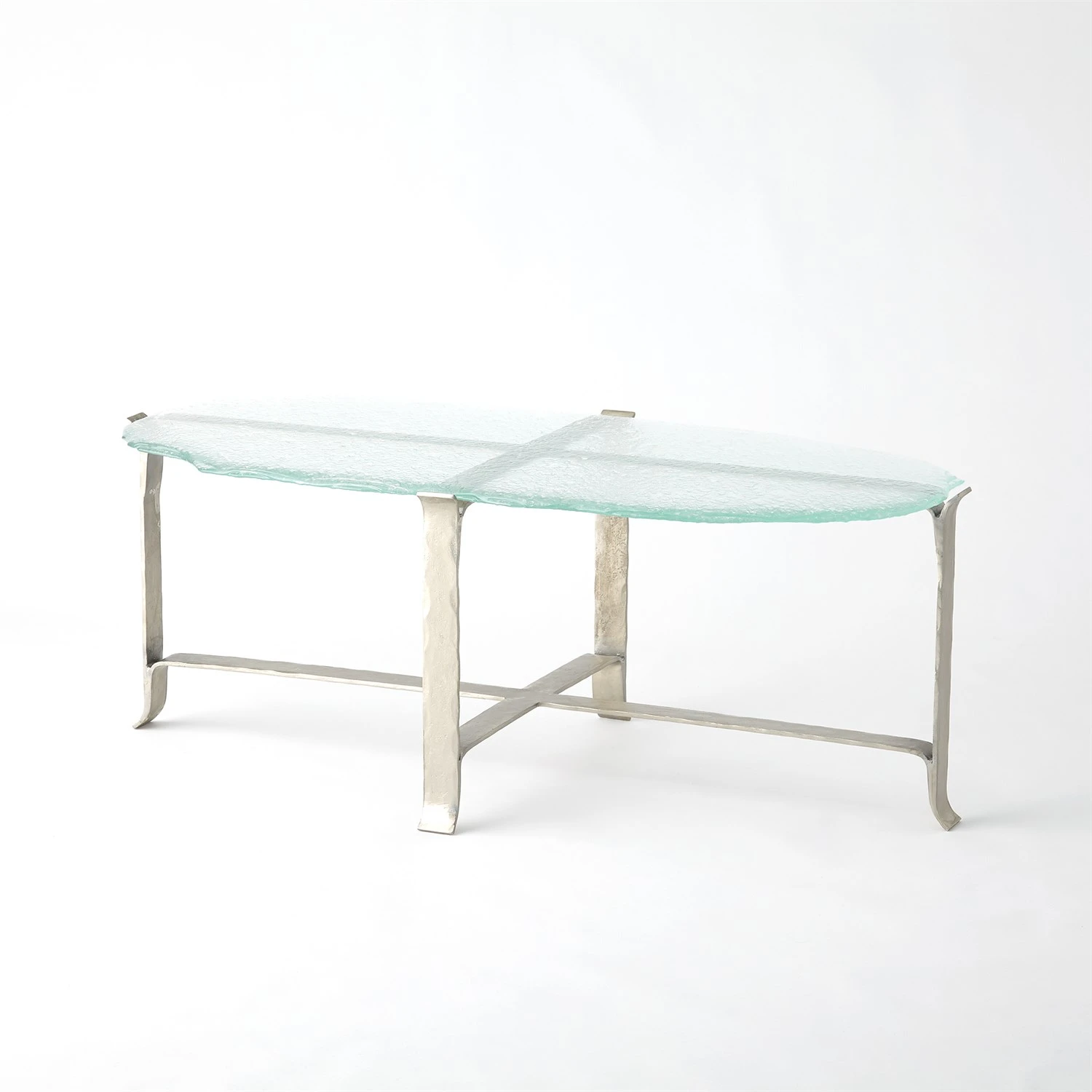 The Melting Glass Table Collection offers a unique way to add interest to your space. Italian glass has been “melted” in layers to create a truly unique tabletop. Placed atop an iron base finished in a polished nickel metal tone.