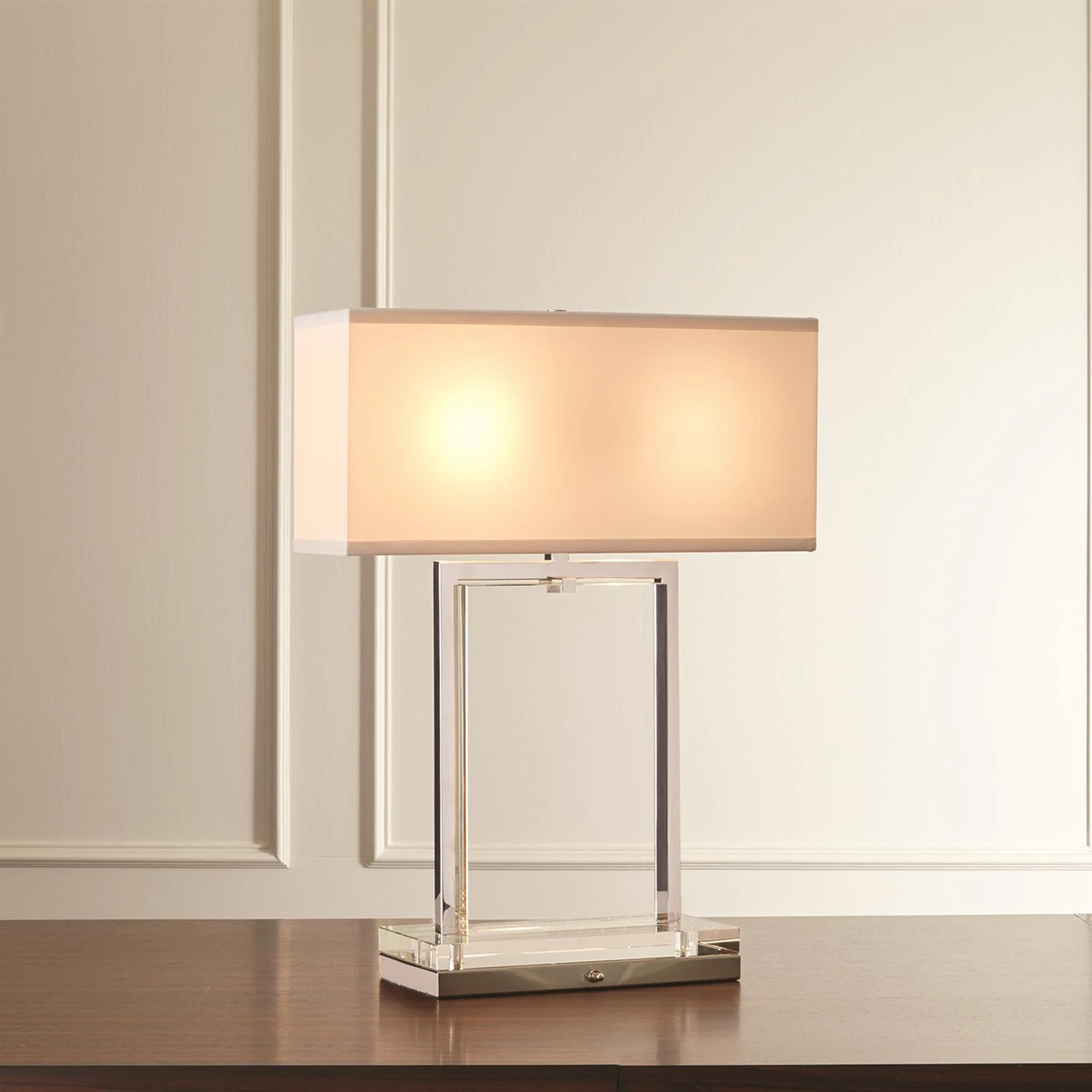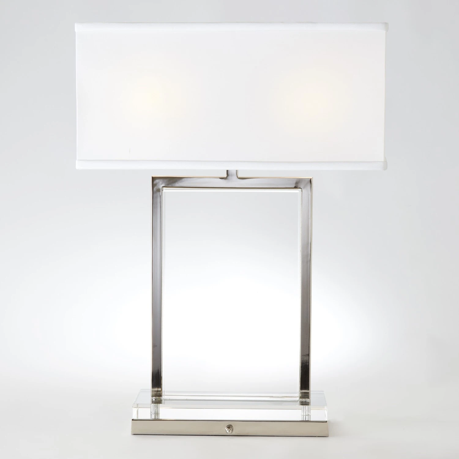 The simple beauty of Global Views’ Crystal Slab Lamp in a mini version is sure to bring a quiet elegance to any room. Featuring a sleek crystal base and rectangular hardback shade covered in ivory silk, the lamp holds two 60watt “A” lamp bulbs and has an easy-to-access switch at the base.