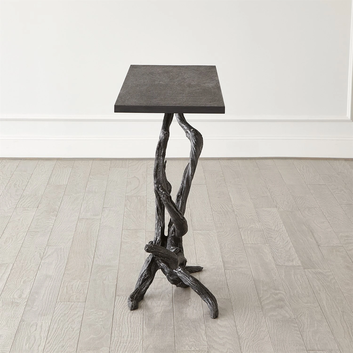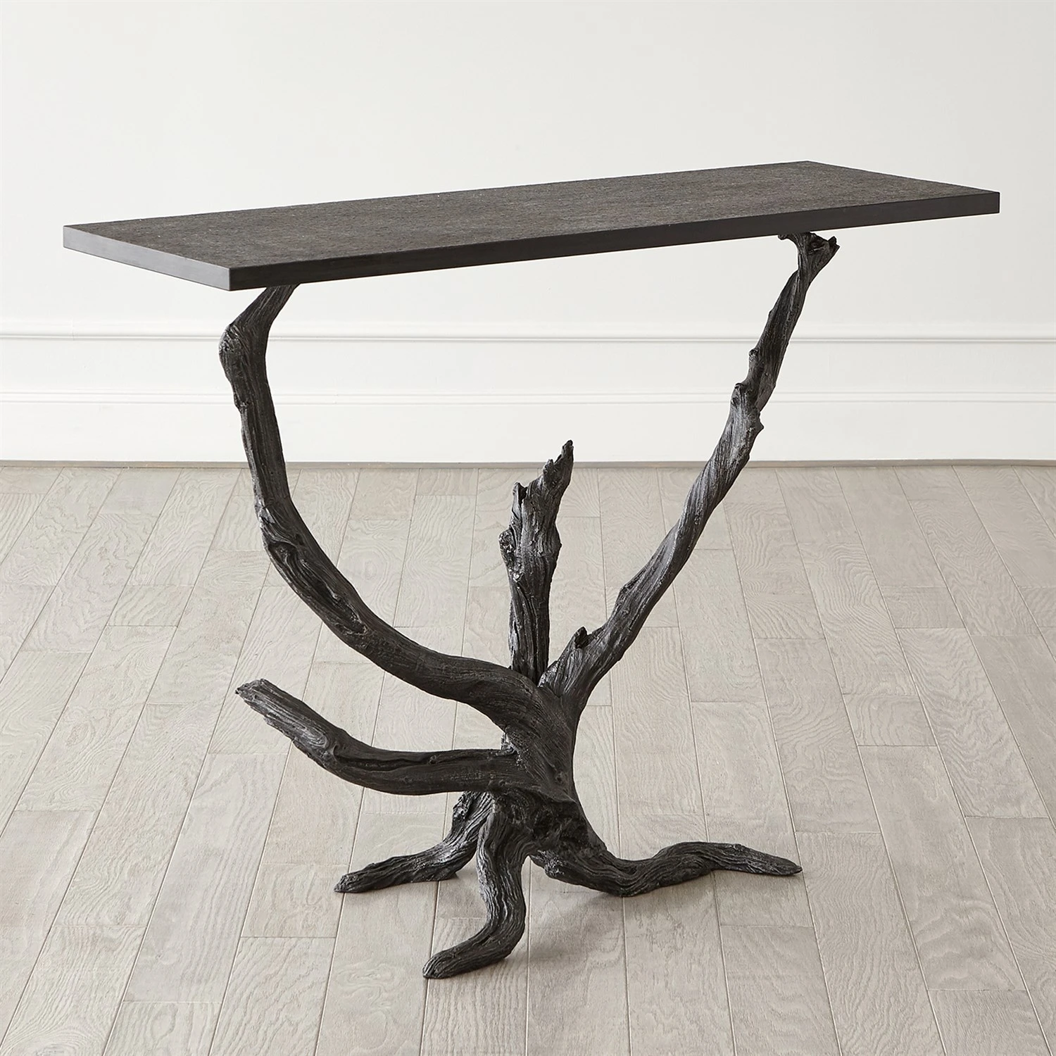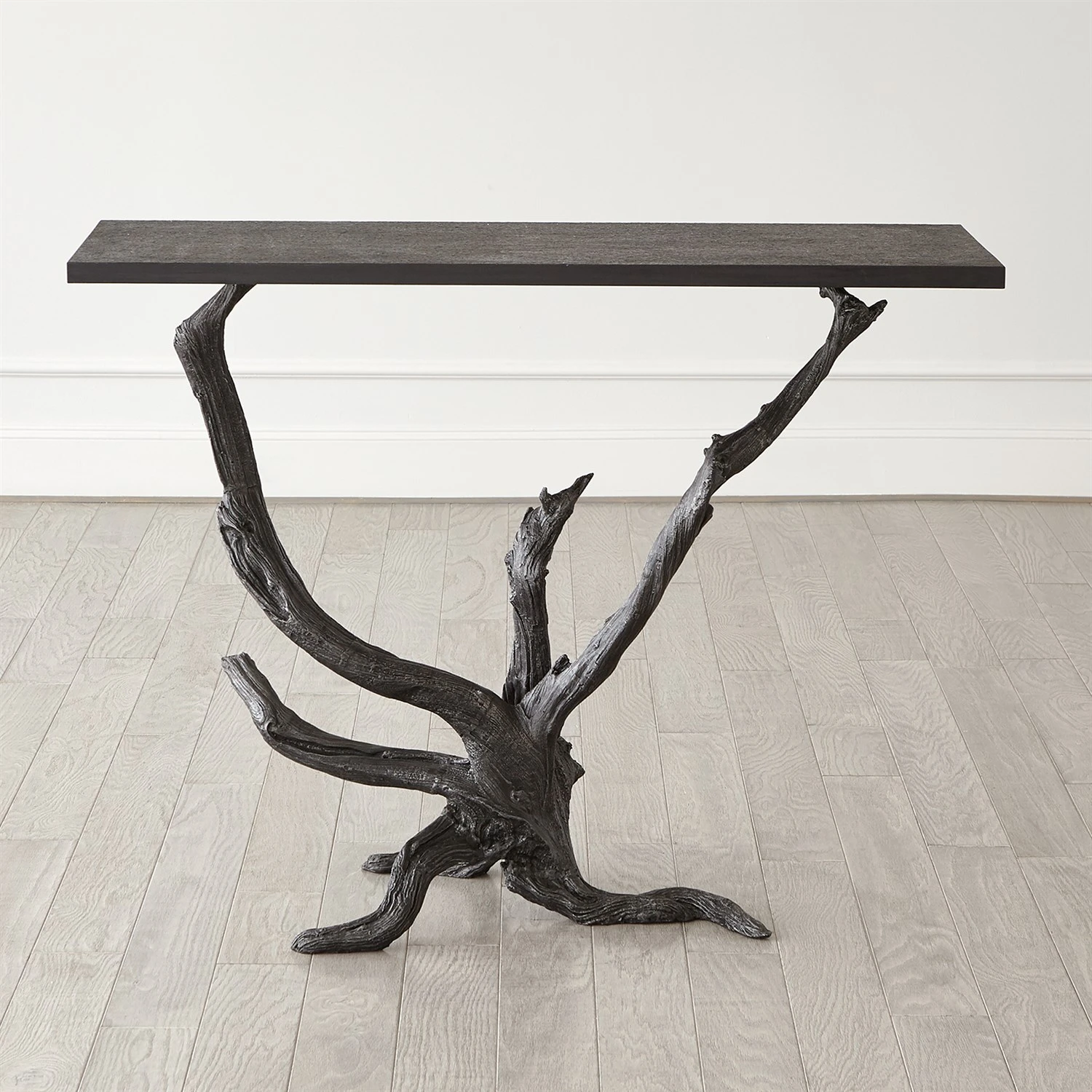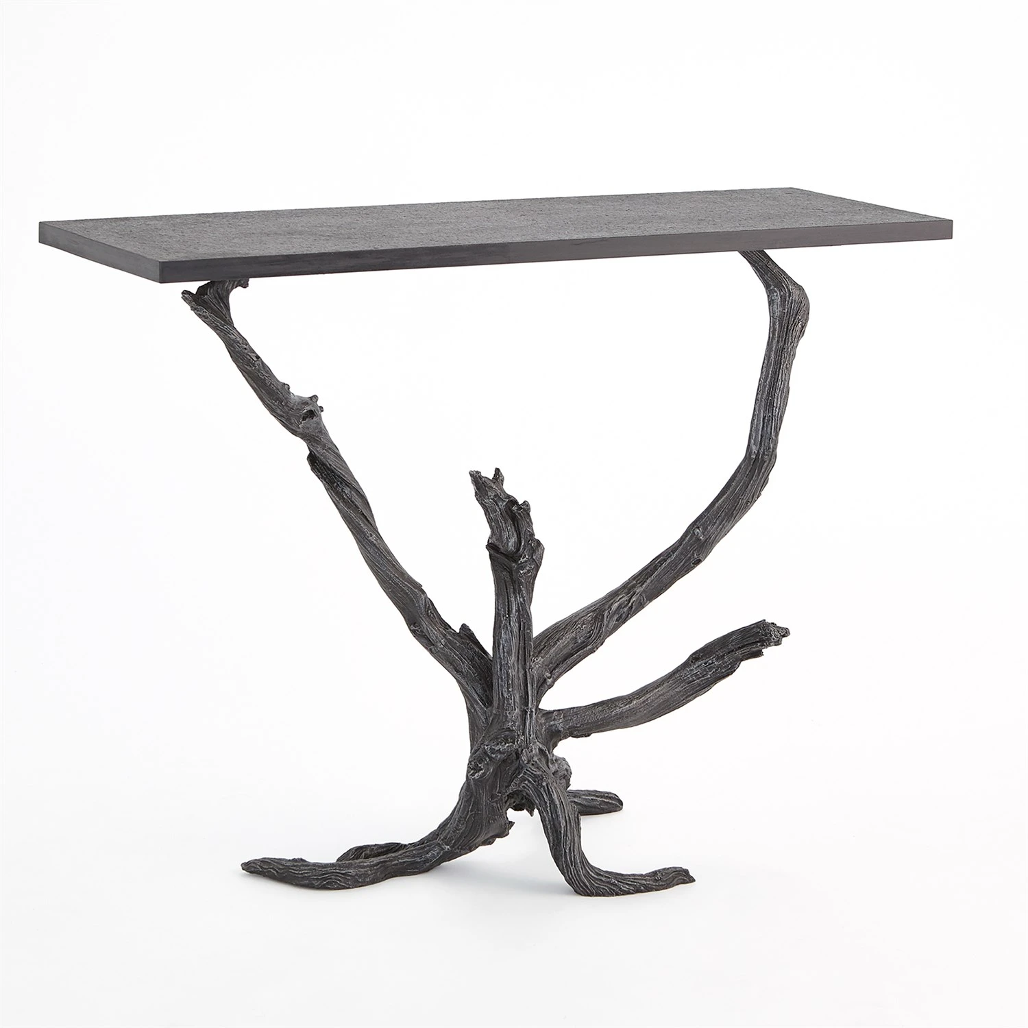 The Monterey Console is made of sand casted iron with a hand painted natural iron finish and honed black marble top.