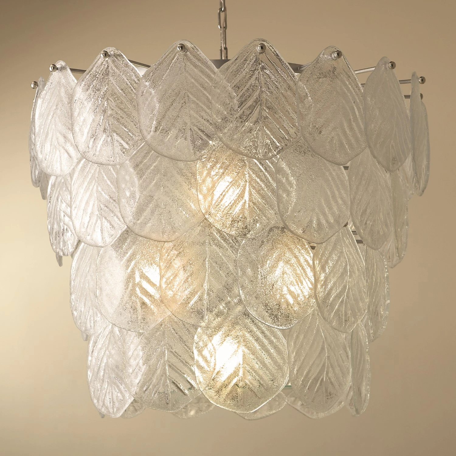 Handmade art glass leaves made in Murano Italy. Frame: Powder coated metal. Glass leaves are secured to the frame with polished nickel finials. Comes with 42 inch heavy duty polished nickel chain and a polished nickel ceiling cap. Light fixture may require reinforcement in ceiling structure to support weight