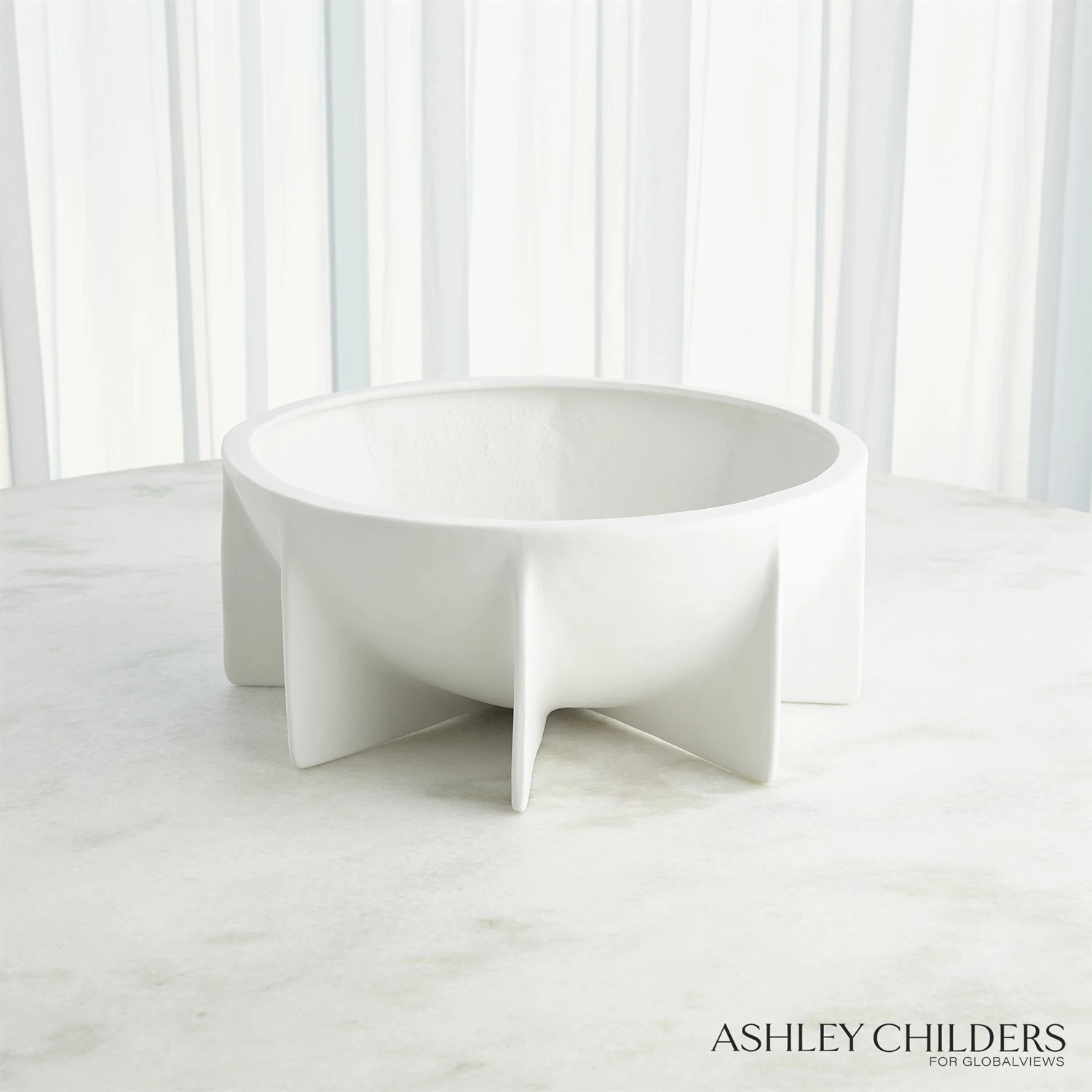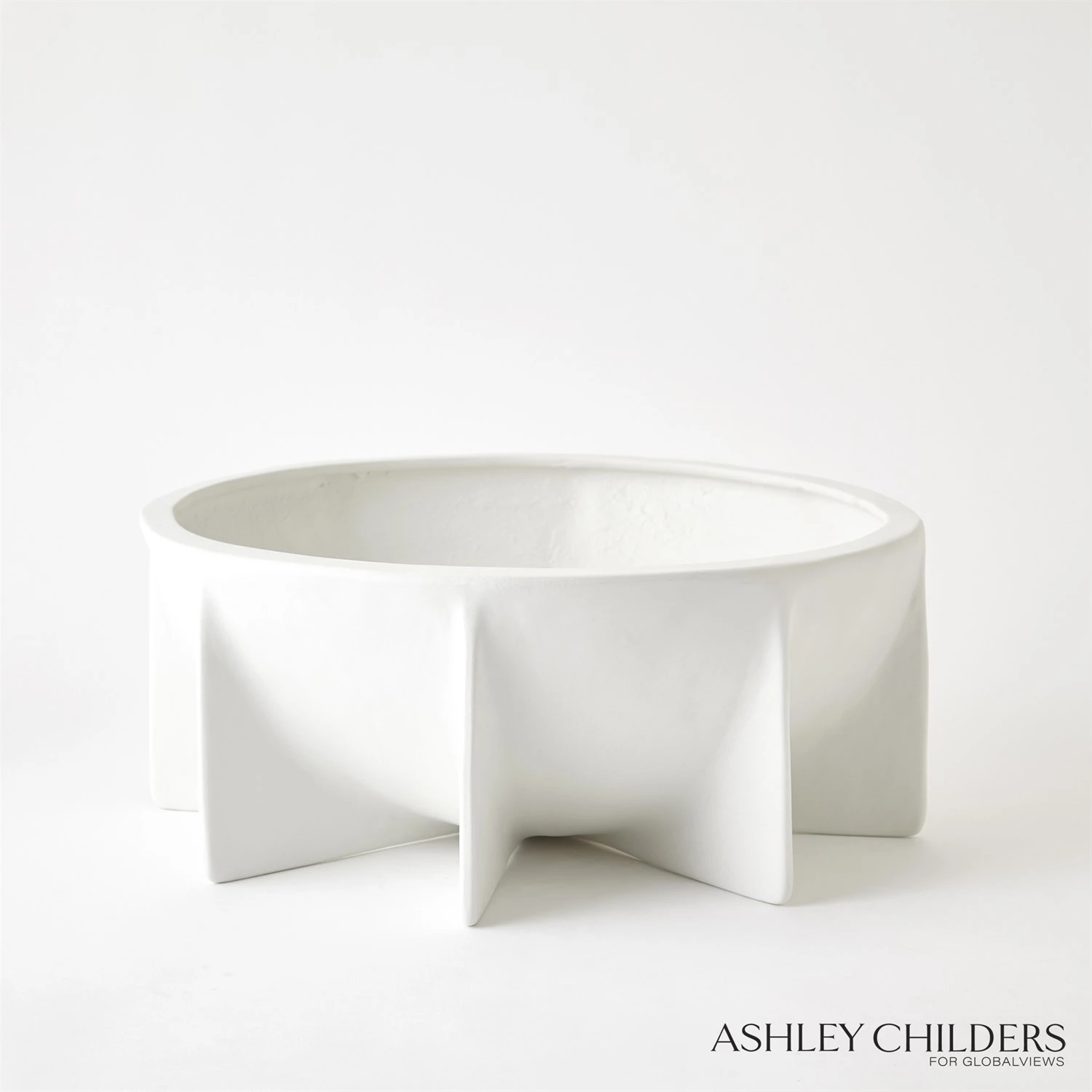 Our Nove bowl features a deep vessel with beautifully thin vertical legs and a matte white glaze. This design is perfectly proportioned to serve as a grand sculptural statement on any tabletop.