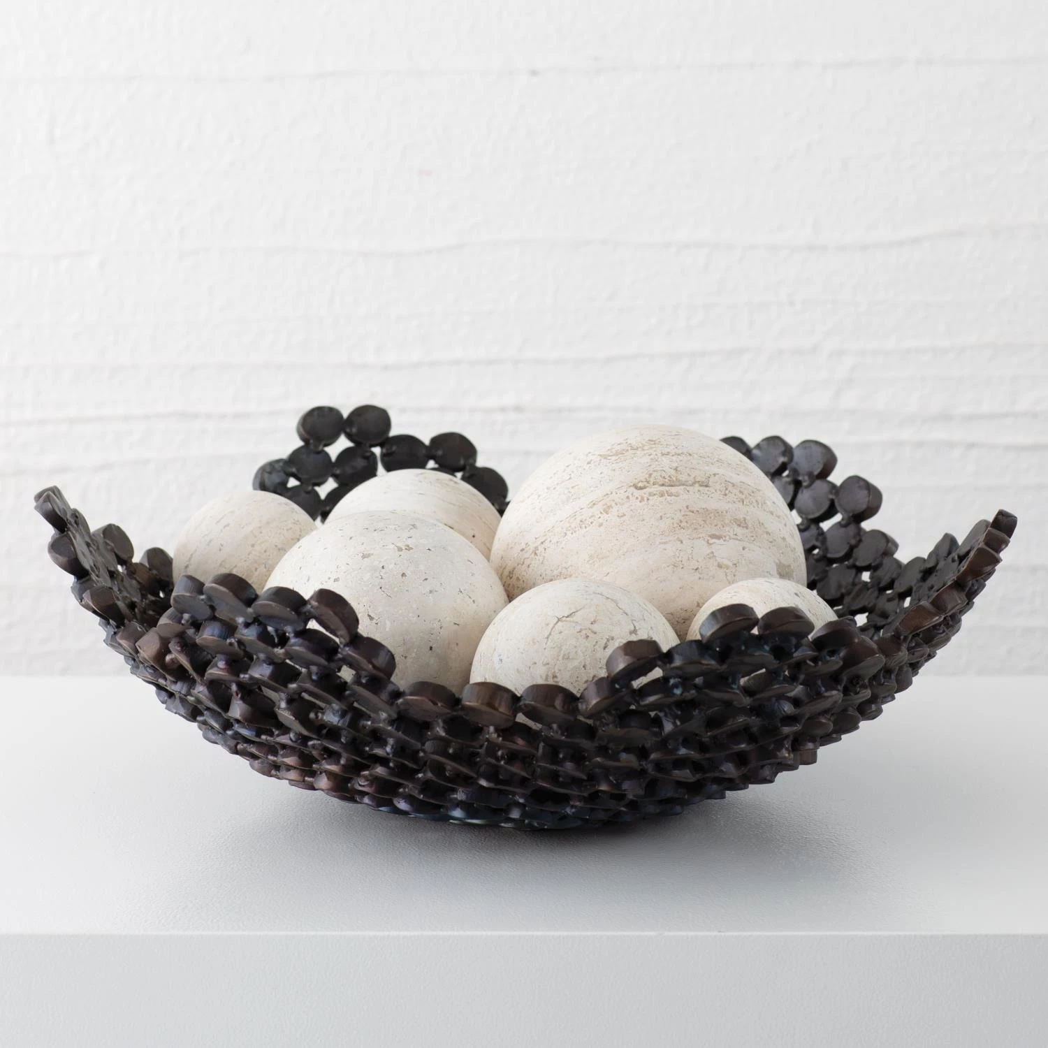 The iron “nuggets” of this collection are reclaimed scraps of metal from the factory floor which have been repurposed with great imagination. The individual pieces have been welded together in irregular shapes, then torched. Recycling at its best!