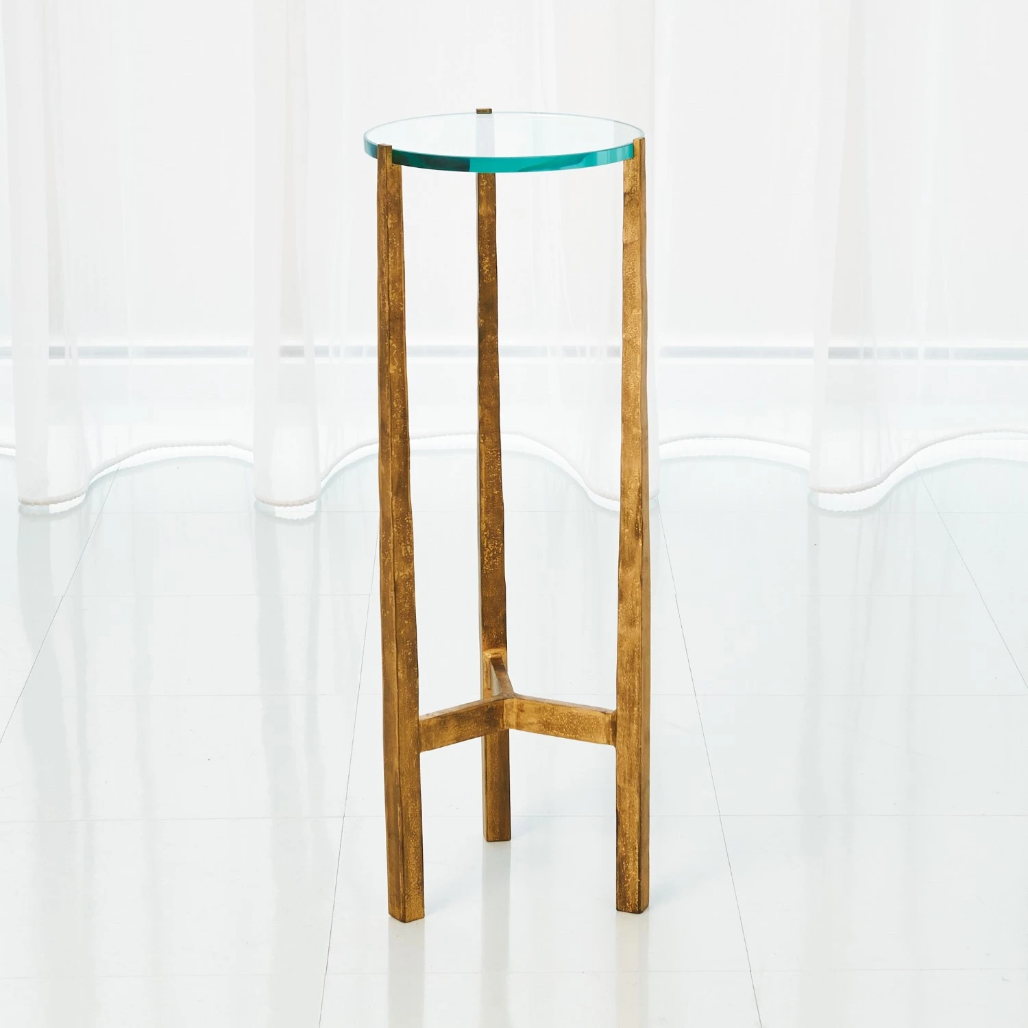 A very petite iron tripod occasional table holds a 1/2 inch thick glass lens. Available in Antique Gold and Natural Iron finishes
