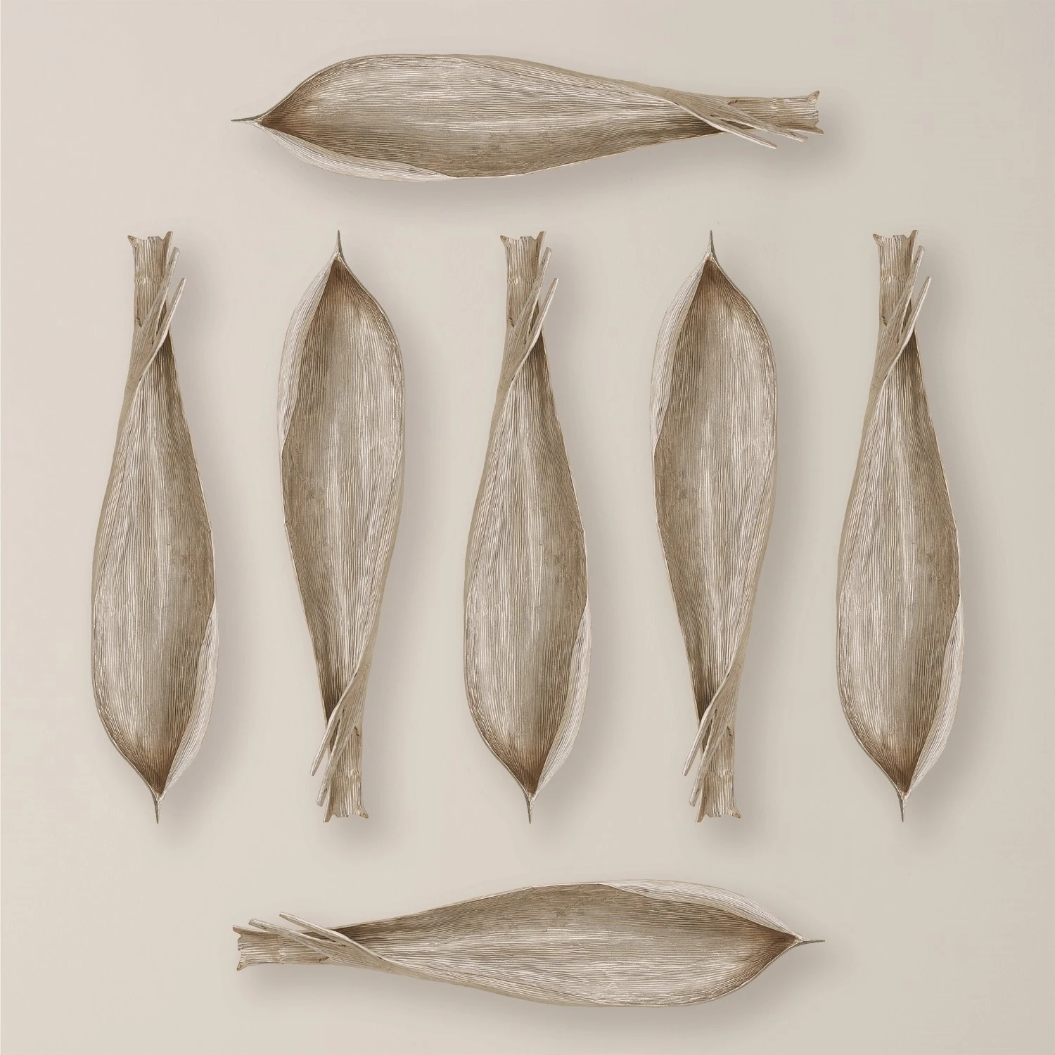 Cast from a palm seed pod originally found in Florida, this footed version can rest tabletop or hang as interesting wall decor. Pre-installed hanging mechanism on the underside allow for it to hang vertically or horizontally. Nickel finish over aluminum.