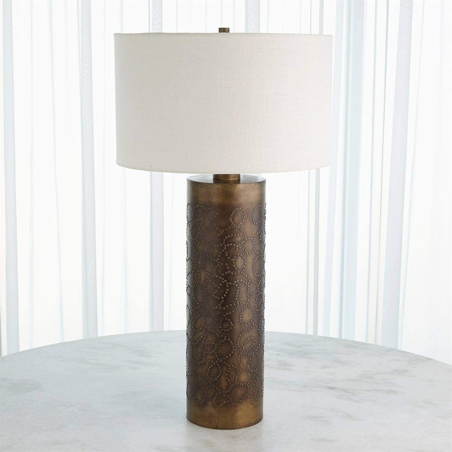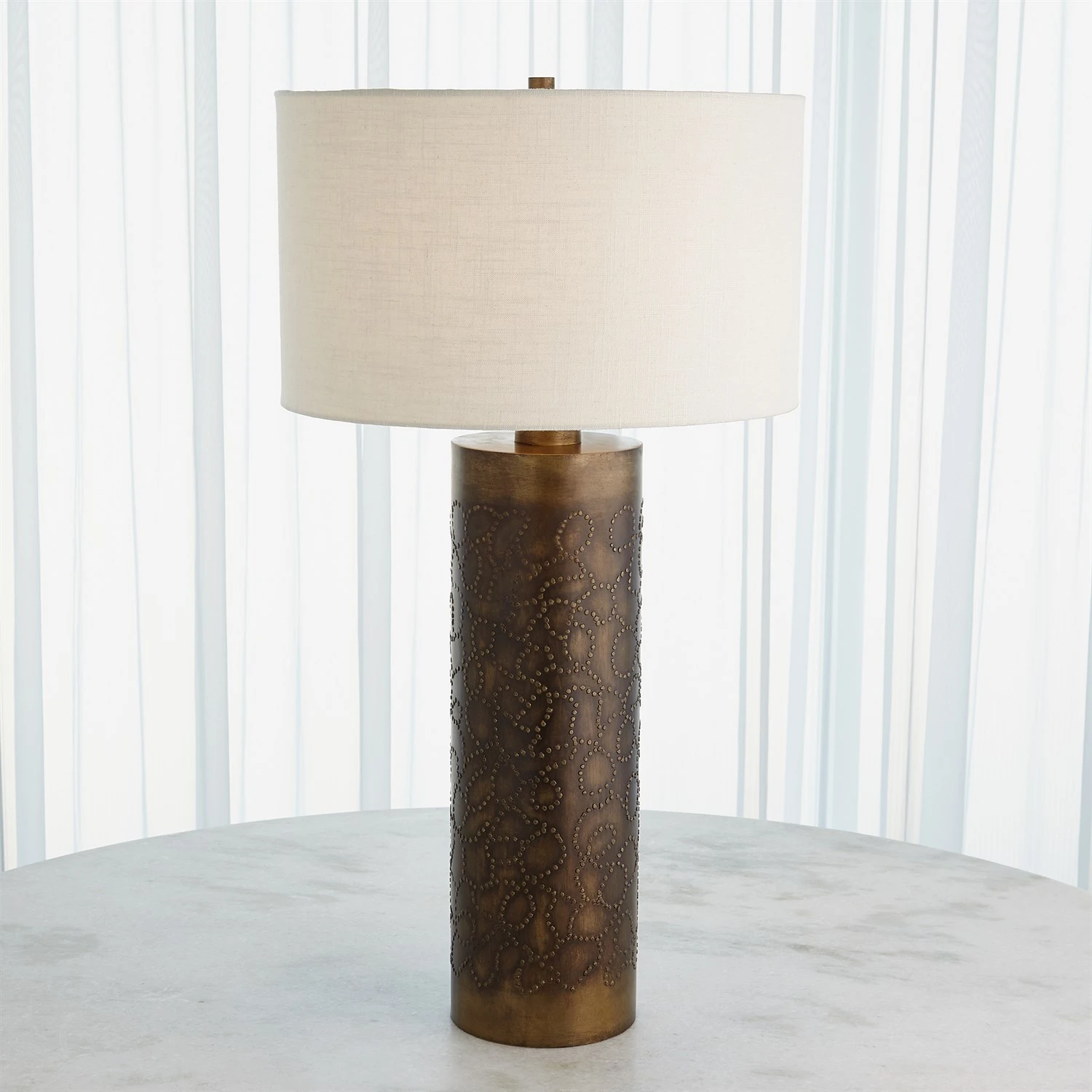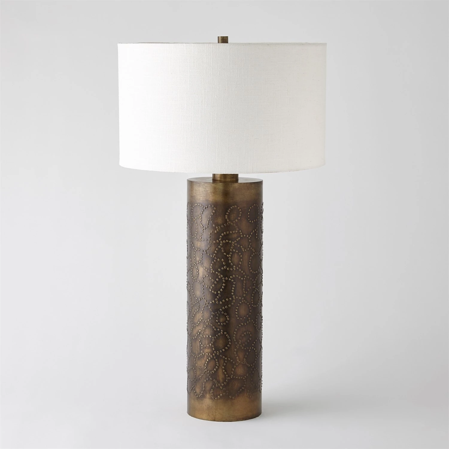 The Paten Lamp is crafted of iron with antique brass finish and features hand-applied details. Hardback fabric shade.