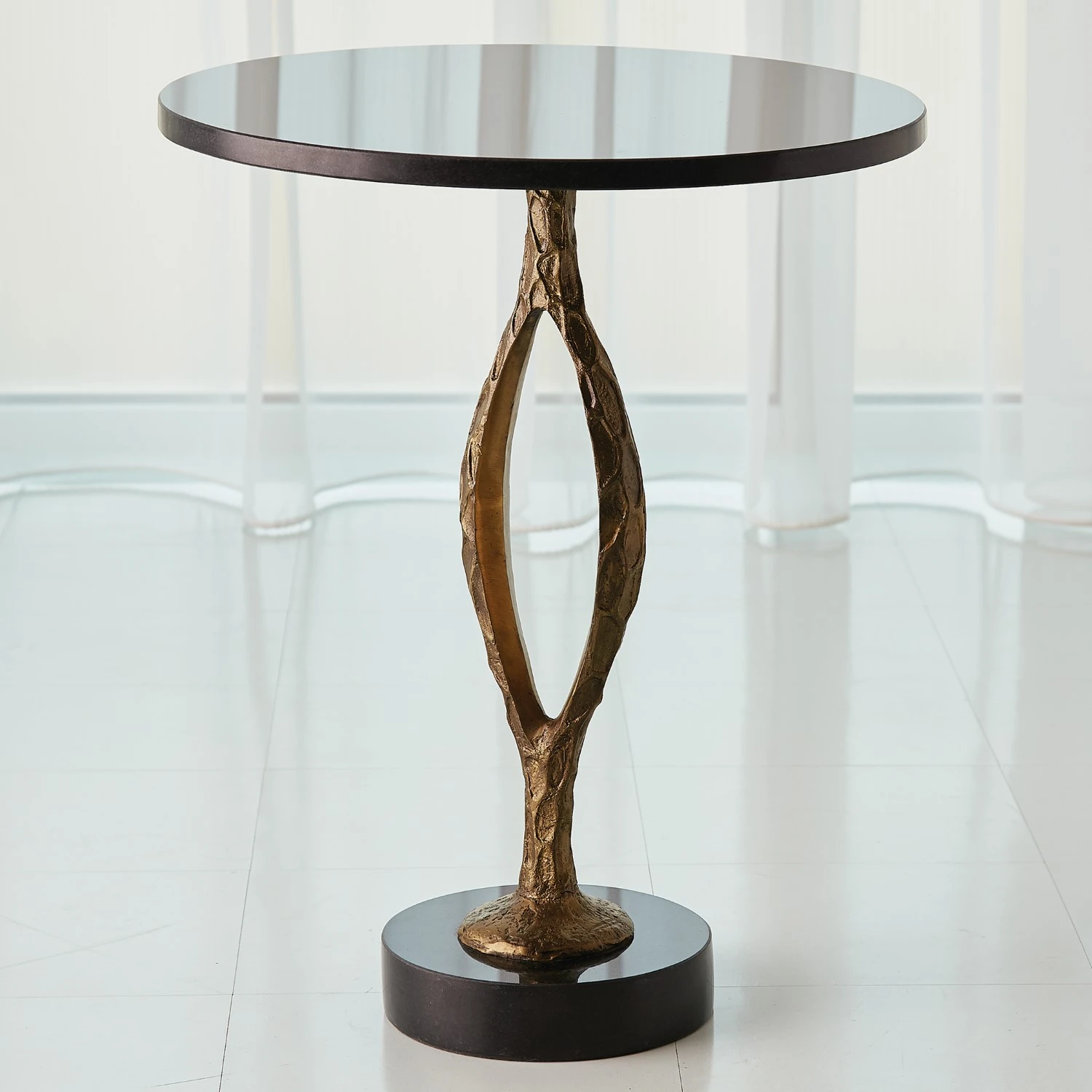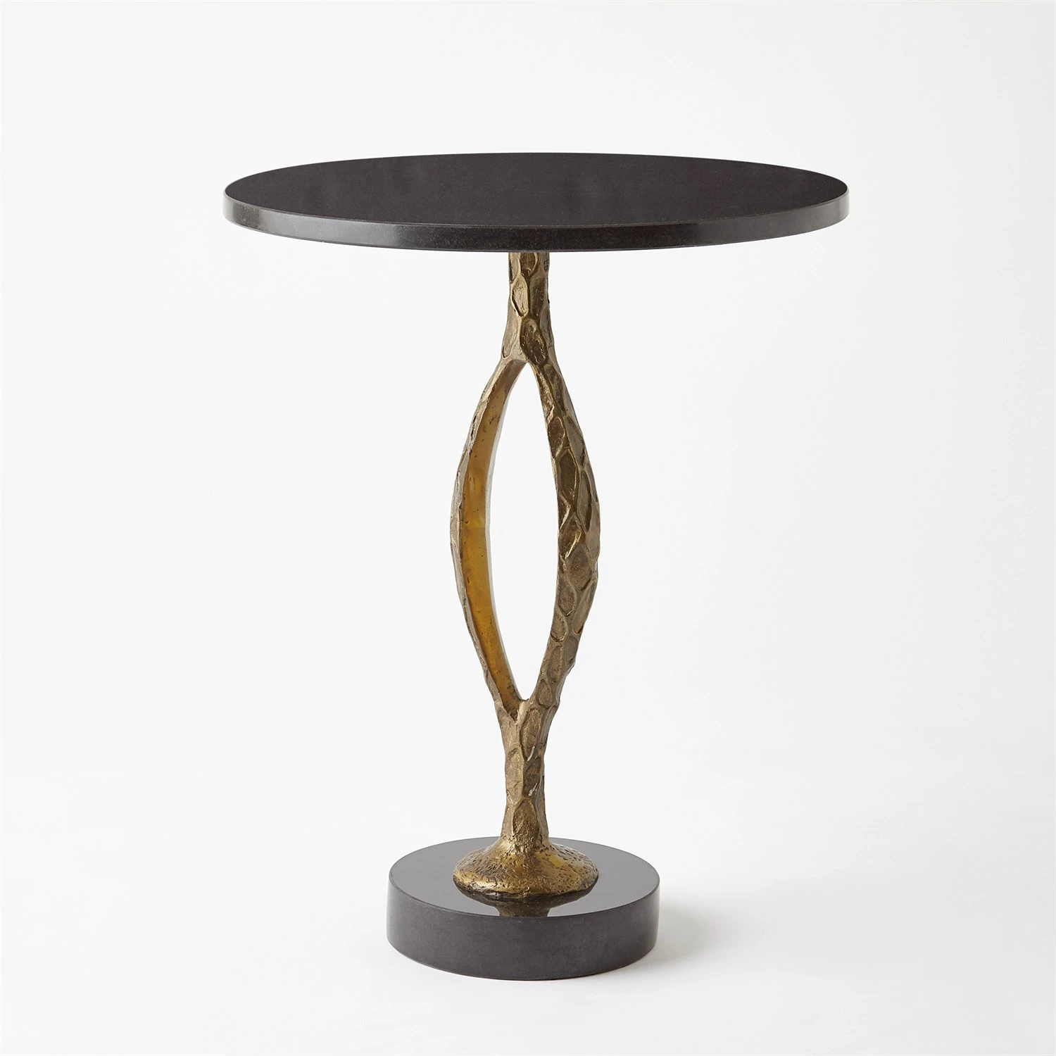 Inspiration was taken from an immense architectural screen in Europe which gave way to our Pod accent table. Each detail is captured in cast iron, hand finished in antique gold and black granite base.