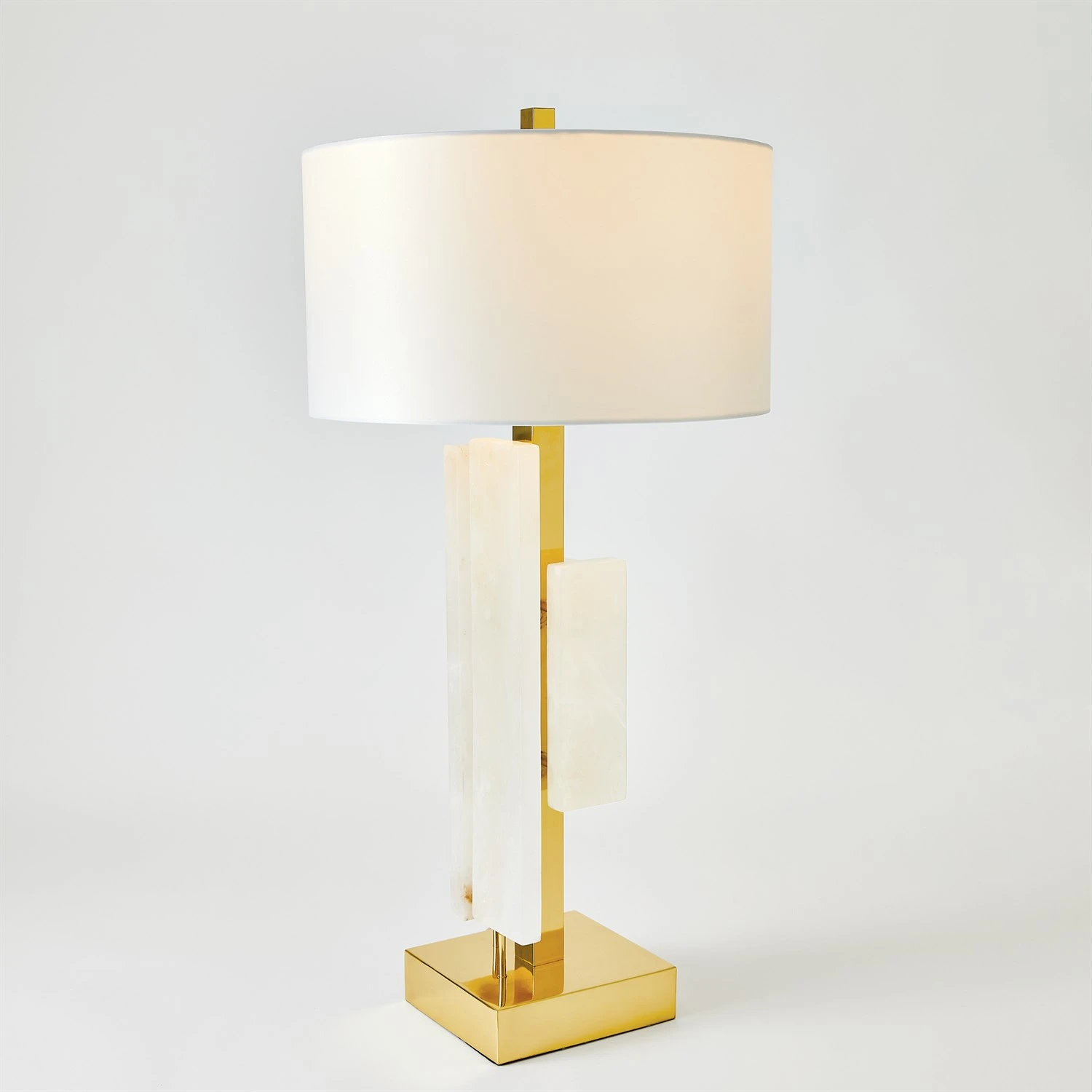 The Posh Block Table Lamp features a brass base and four sheets of alabaster with a hardback fabric shade. As alabaster is a natural product, please be aware that there will always be variations in veining and color. This is to be expected and makes every alabaster product uniquely your own.