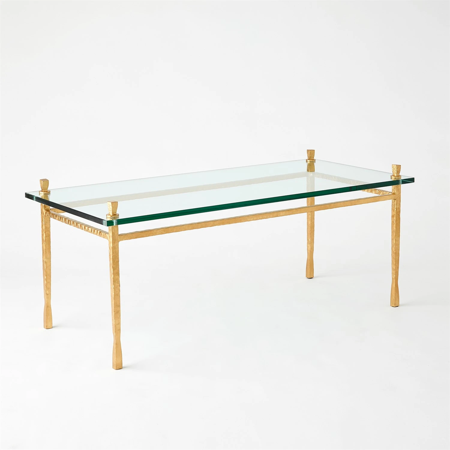 A 5/8-inch thick glass top seems to float in the frame of the Quad Pod Cocktail Table. The solid iron table has a gold leaf finish. Also available in Natural Iron finish.
