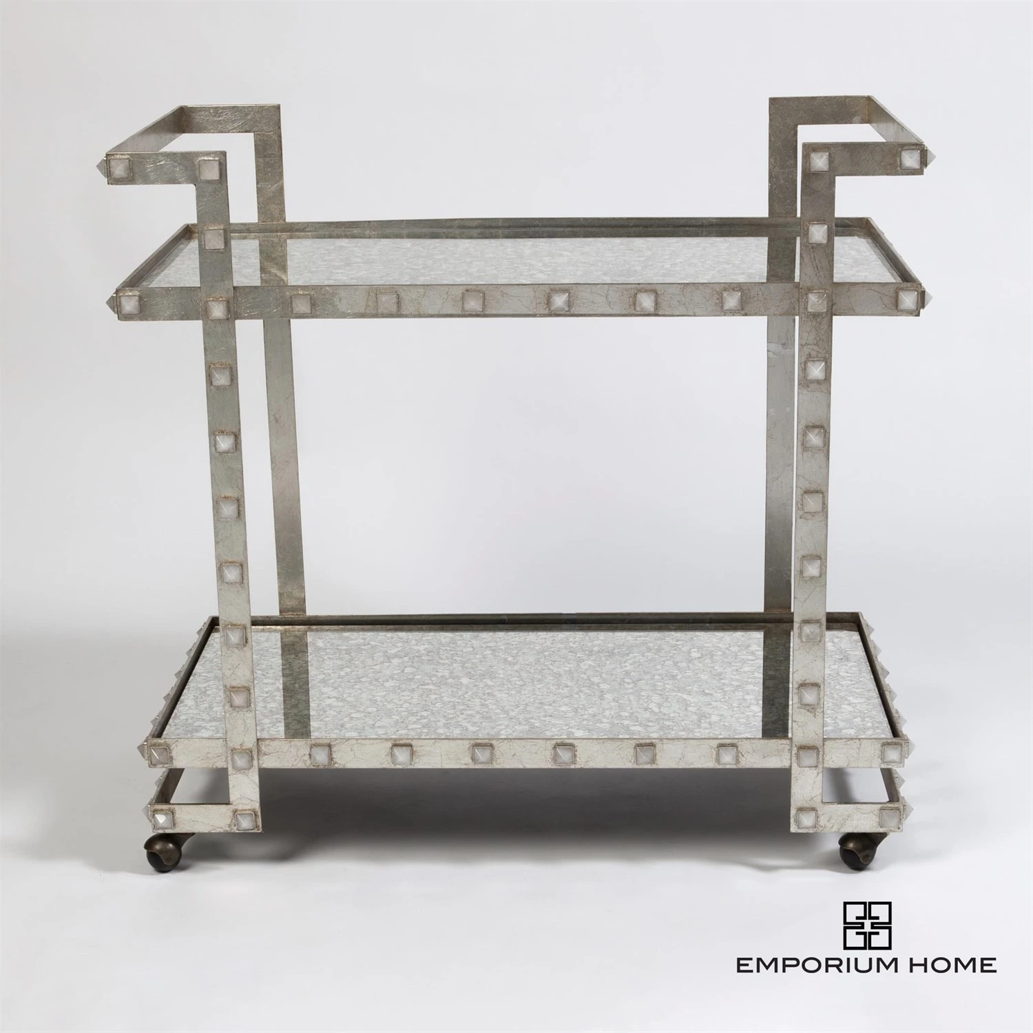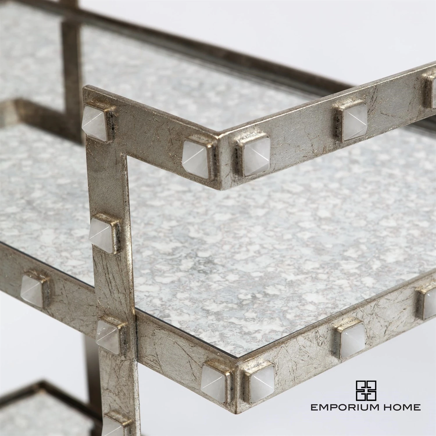 Our Quartz Stud Bar Cart is the perfect mix of high glam with rock and roll chic. Each natural quartz crystal stud is hand set into a gilded silver leaf frame with an antique beveled mirror top and shelf. Roll this gorgeous bar cart into any room and create the chicest cocktail situation your home has ever seen.