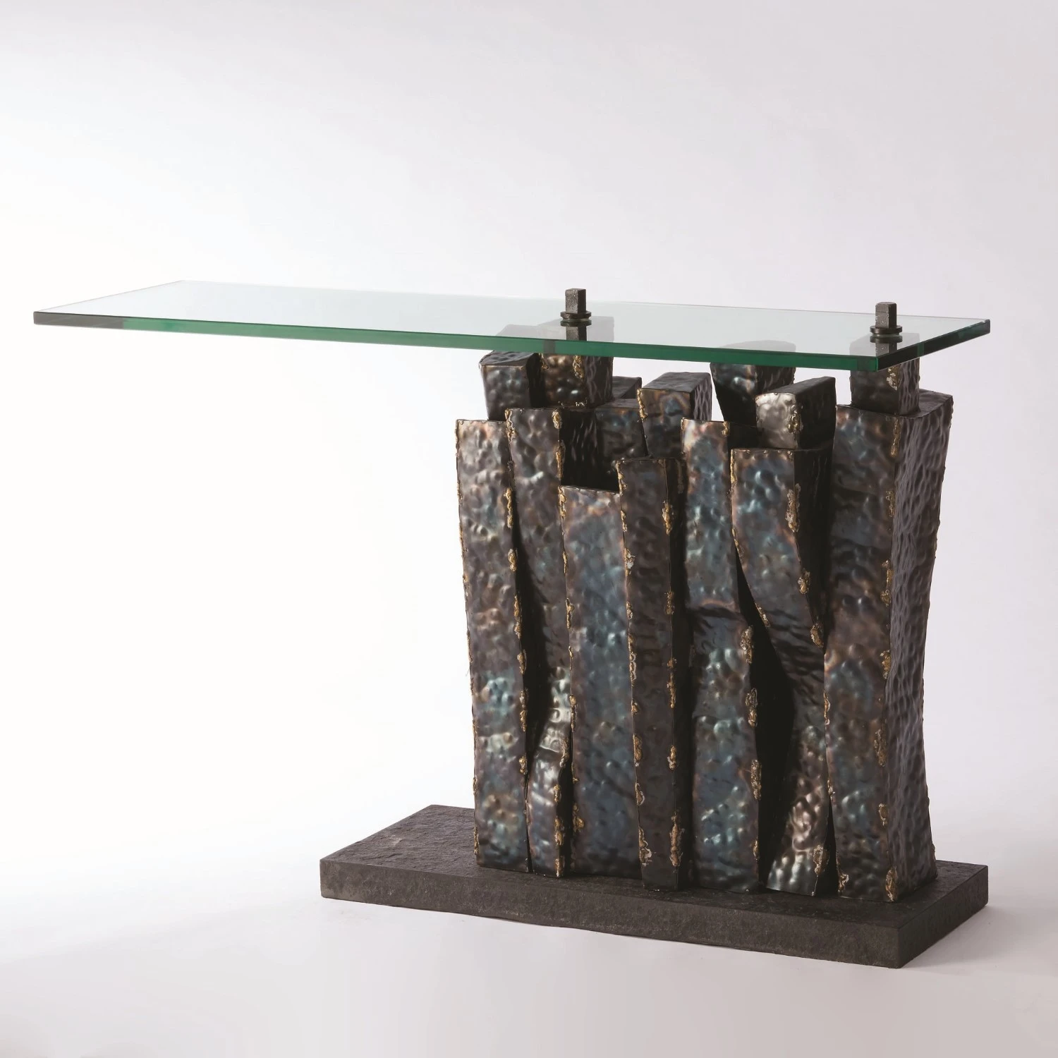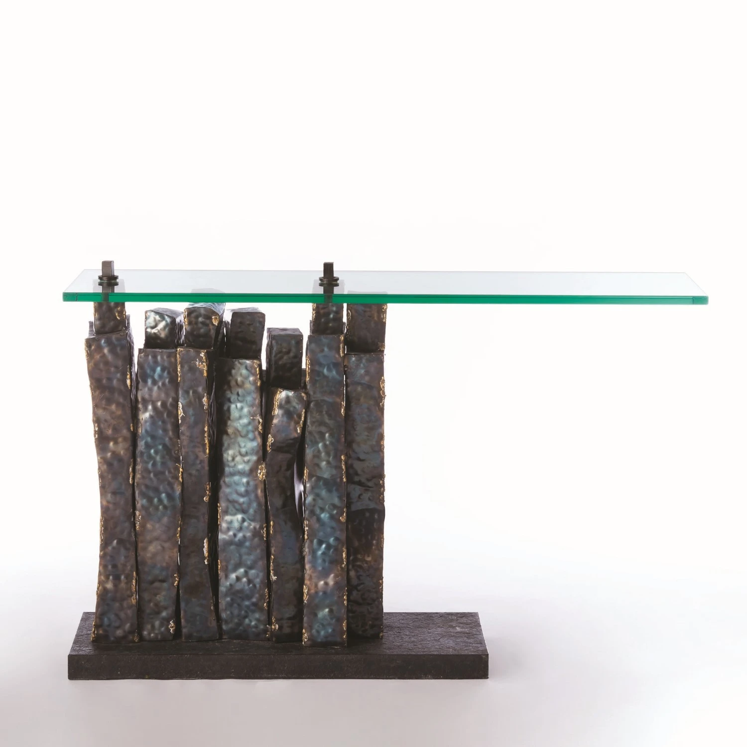 Queue is a tour-de-force of Brutalist style. The base is an assemblage of randomly shaped figures standing in “queue” which support a cantilevered glass top. Attachment points protrude through the glass from the base below. The sheet iron figures are hand-distressed and held together with brass braising, then given a torched finish. All rests on a honed black granite base.