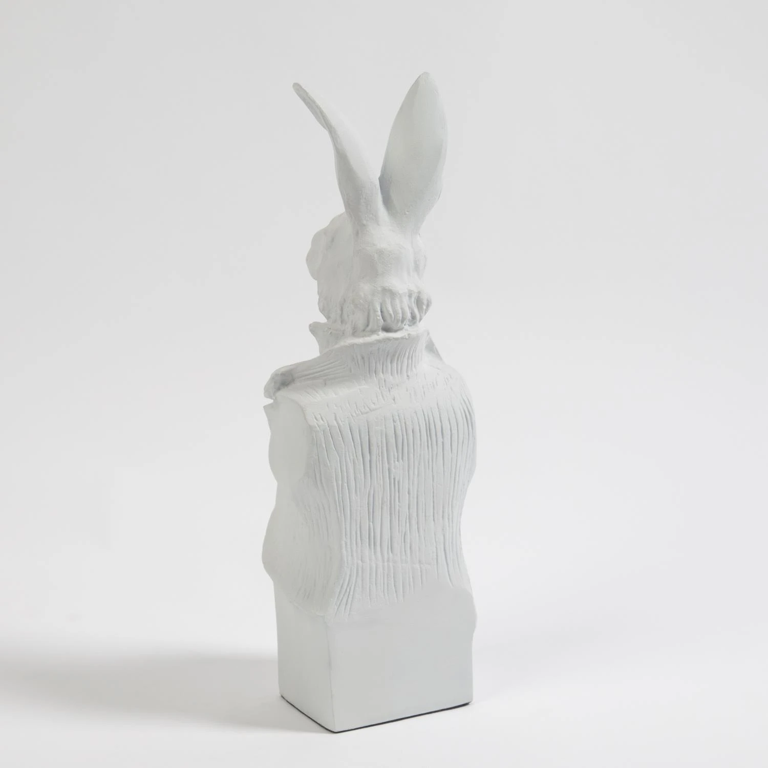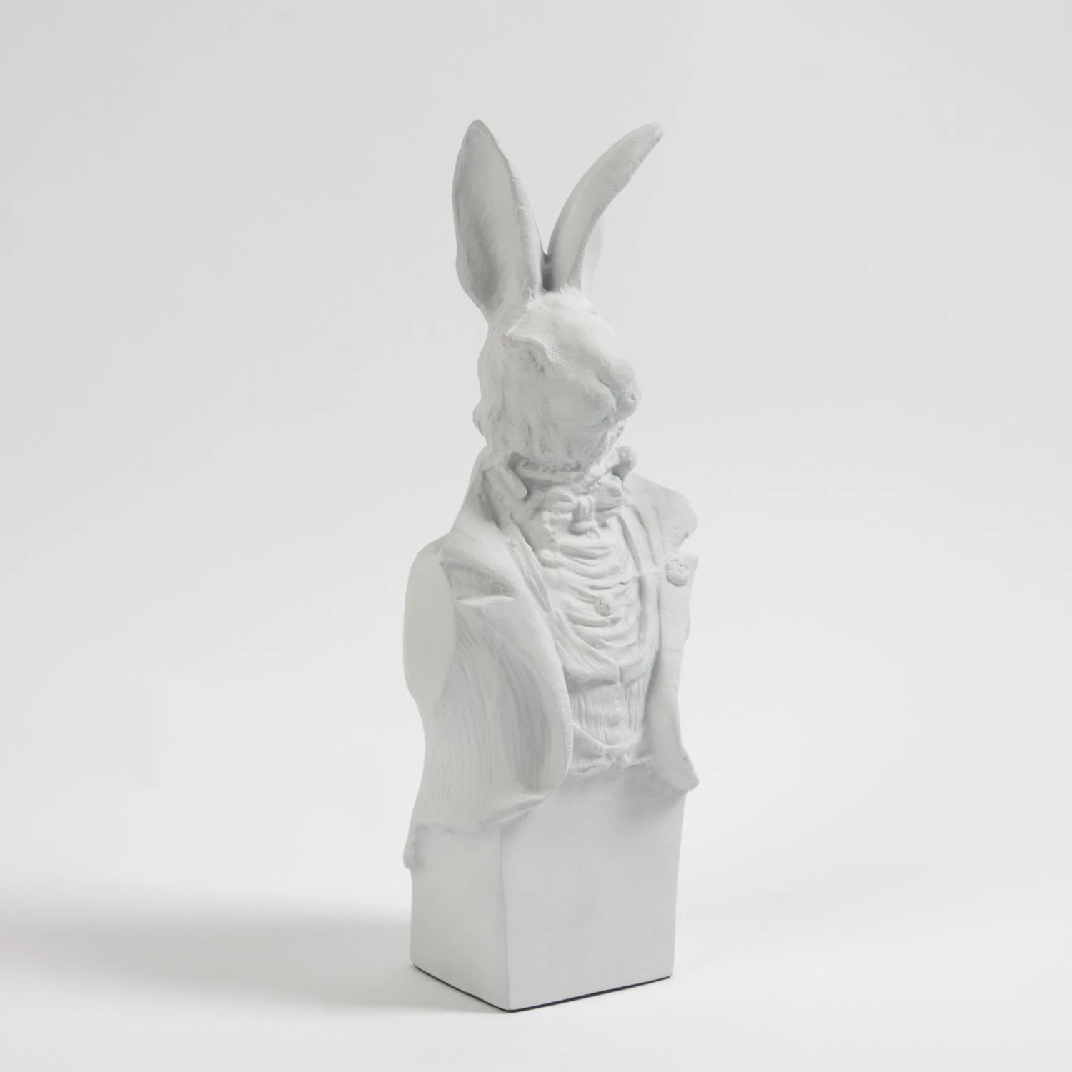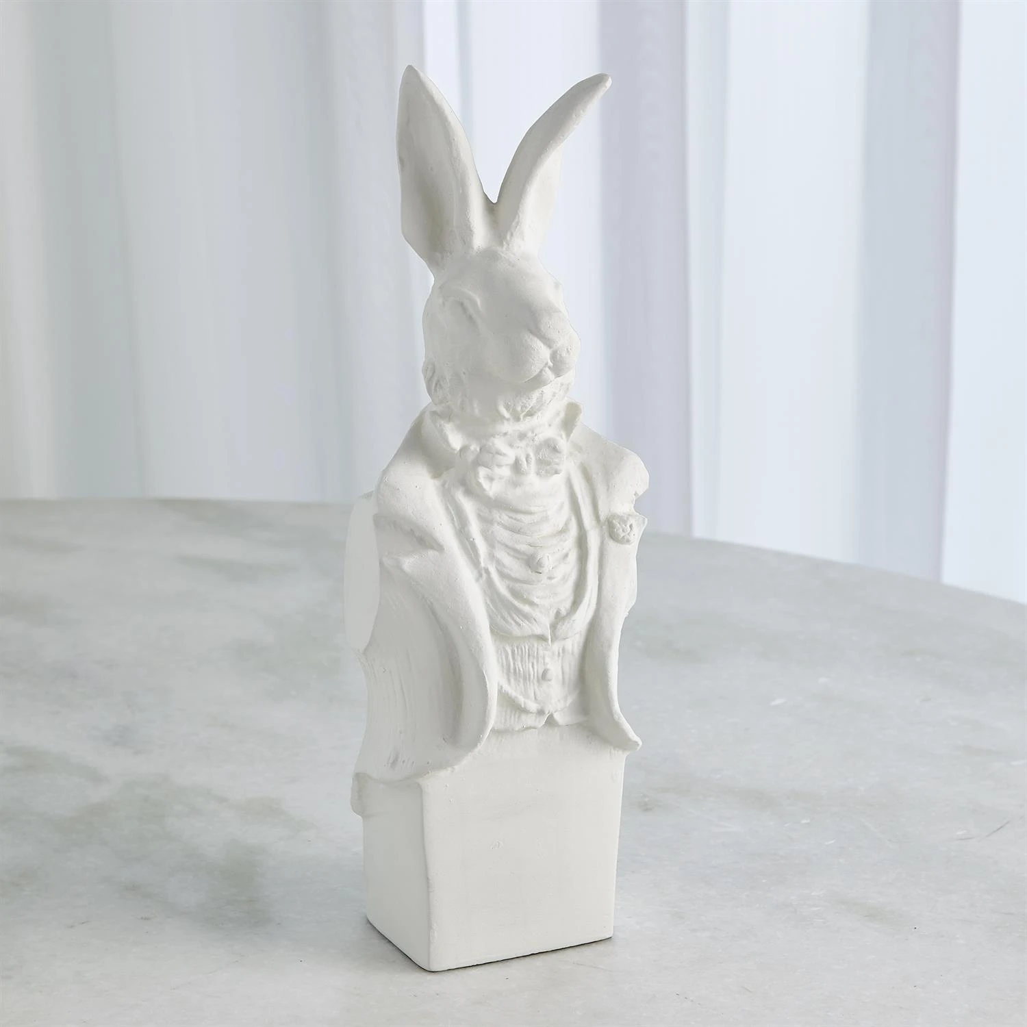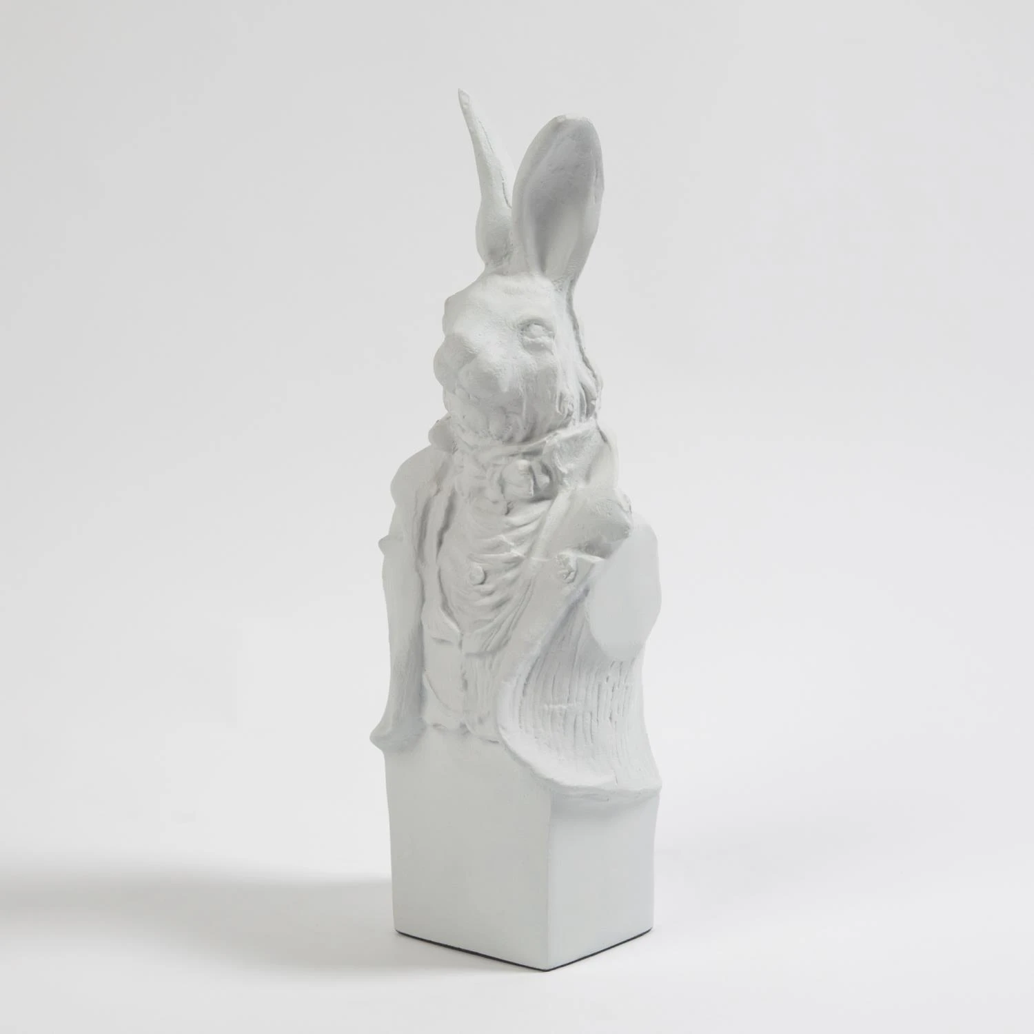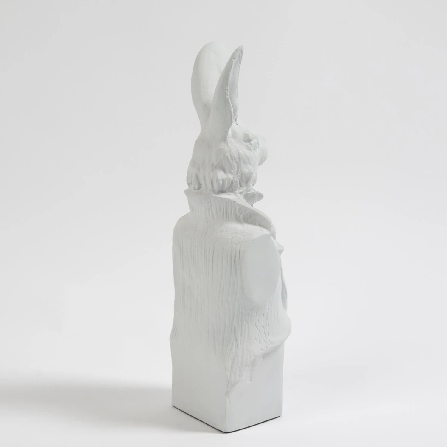 The Arete Collection is renowned for magnificently carved and hand-crafted home furnishings. This exclusive collection for William D Scott consists of nature-inspired accessories. This cast aluminum sculpture is covered in a matte white finish and resembles a fashionable rabbit adorned in a tuxedo sitting atop a rectangular base. Felt tabs on the bottom of the sculpture help to protect any surface this piece rests upon.