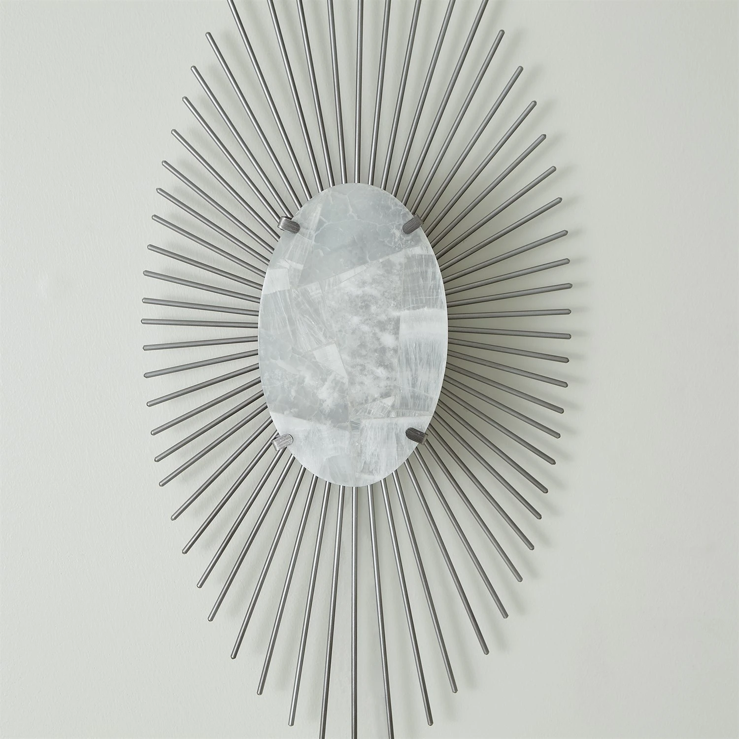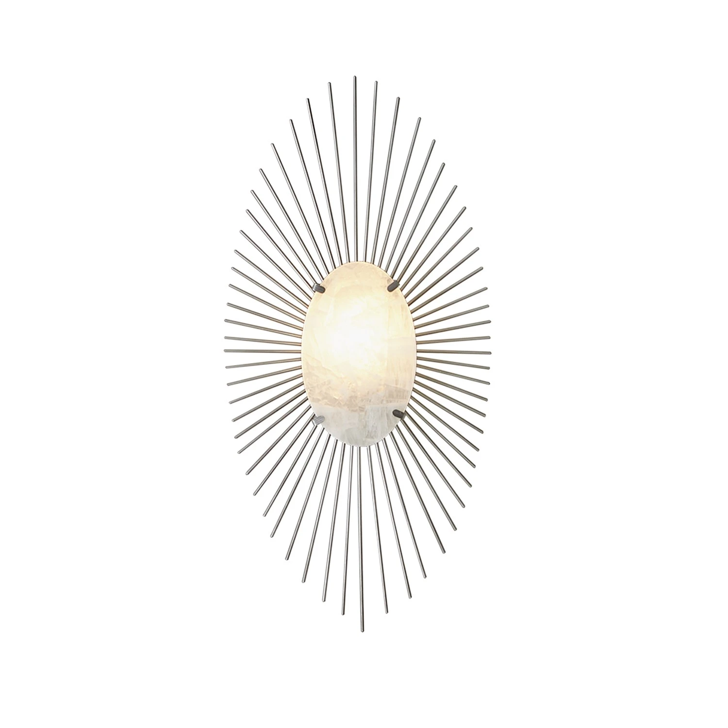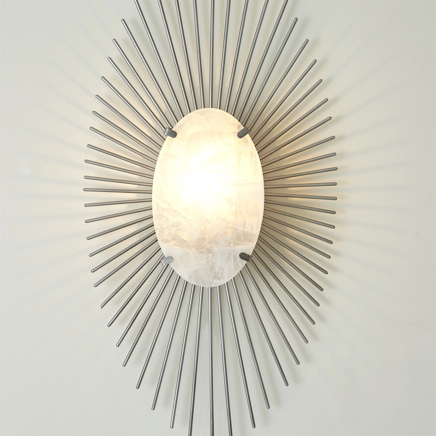 The radial sunburst pattern of the Burst Wall Sconce is dynamic and has tremendous eye appeal. Silver-toned metal with a translucent stone lens allows the light to filter through and create a warm and inviting ambiance. Available in 2 finishes.