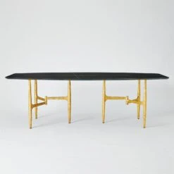 The Radius Tables emulate the look of a slab marble surface executed in high tech Italian ceramic with an articulating gold leaf iron base. Available in a rounded rectangle top with two bases or round top with one base.