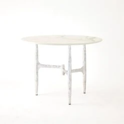 The Radius Tables emulate the look of a slab marble surface executed in high-tech Italian ceramic with an articulating silver leaf iron base. Available in a rounded rectangle top with two bases or a round top with one base.