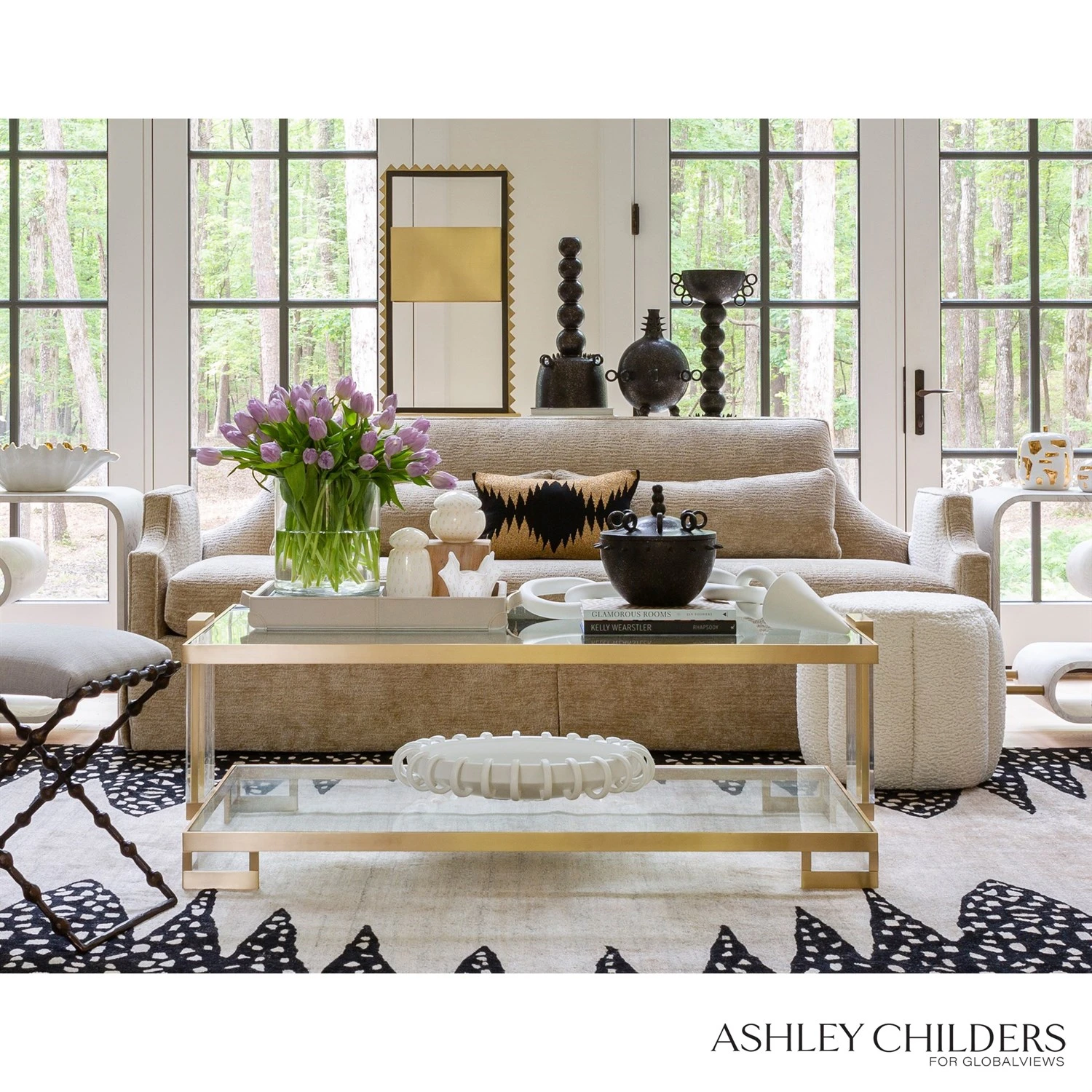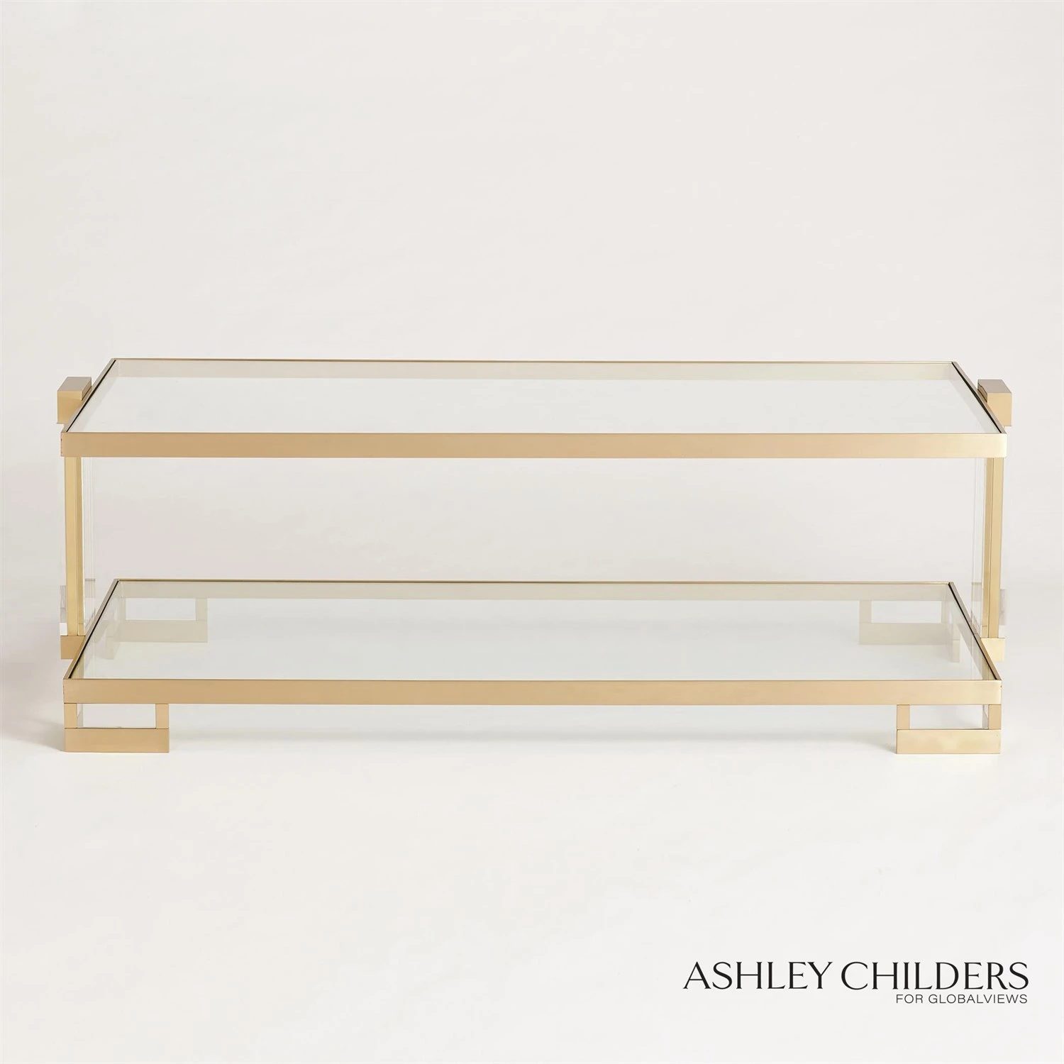 A generous size, solid satin brass frame and Lucite accents make our Railing Cocktail Table a showstopper. Top and bottom glass surfaces provide the perfect space for you to display your most beloved accessories and books.