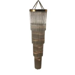 A 96″ oversized iron frame powder painted light bronze plus 48″ of chain supports and canopy holds 16 Type “A” bulbs illuminating 312 glass textured canes. Each cane forms a hook and is 36″ in length with texture down the entire length. Video of glassmaking is available. The vertical stria of the texture of each cane causes light to refract beautifully at each level of the 8 levels of bulbs from top to bottom with 2 bulbs on each level. Total weight estimated at 800 lbs. Includes an overweight ceiling attachment meant to be screwed/bolted/attached to the actual ceiling beams where it is being installed, complete instructions are included. Requirement for a licensed electrician to install this massive and heavy fixture. One singular round light bronze finished strap of brass surrounds the entire diameter of the top level of canes adding a finished detail and touch.