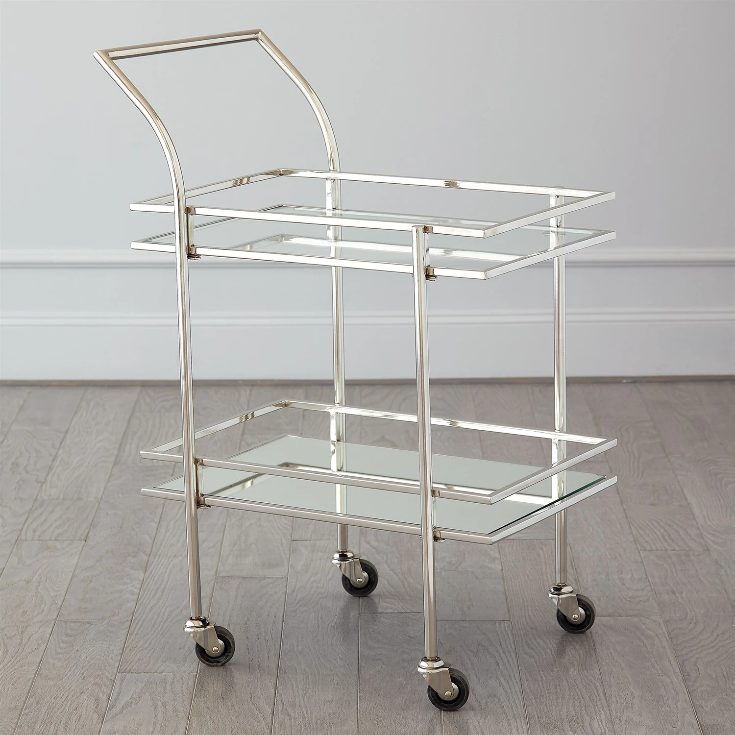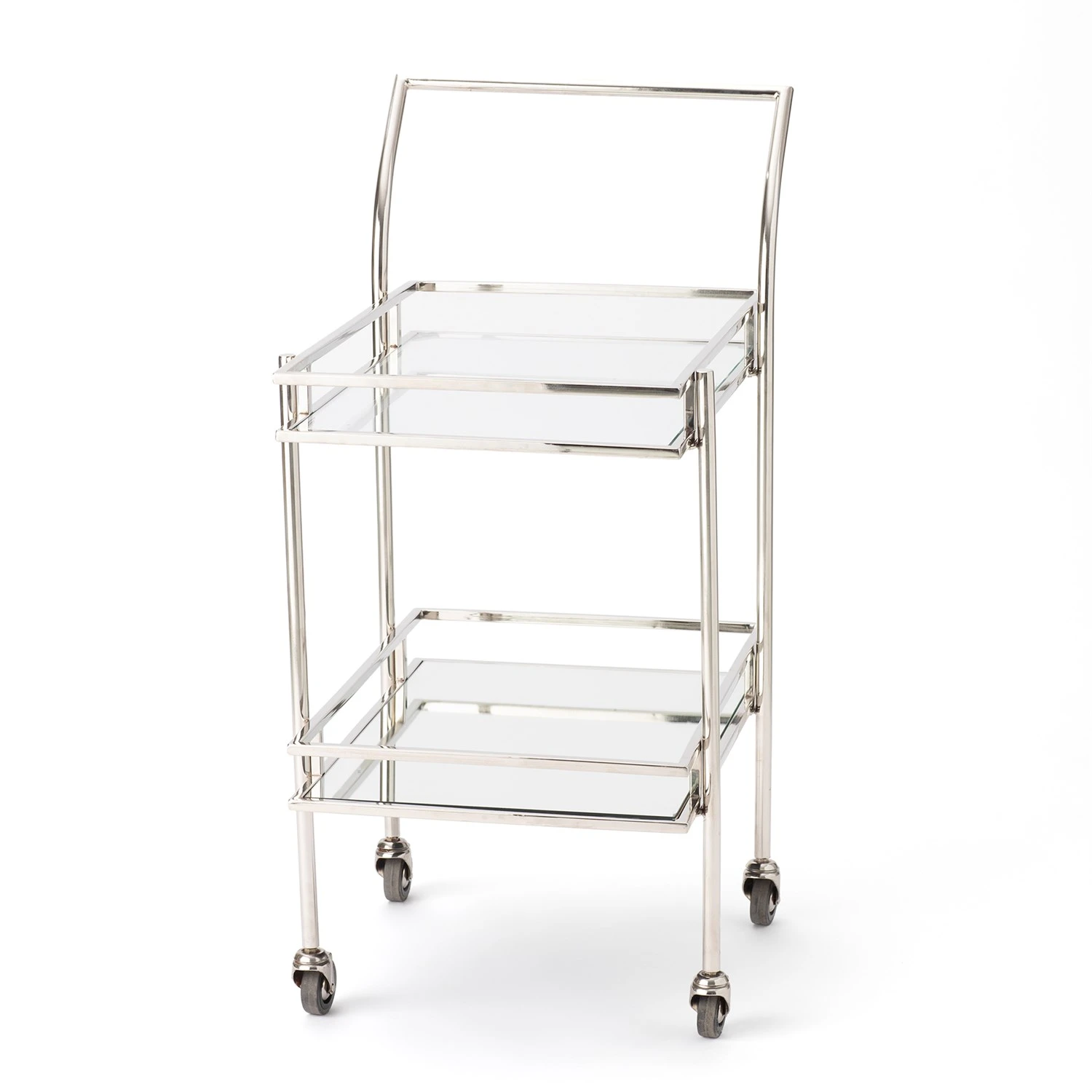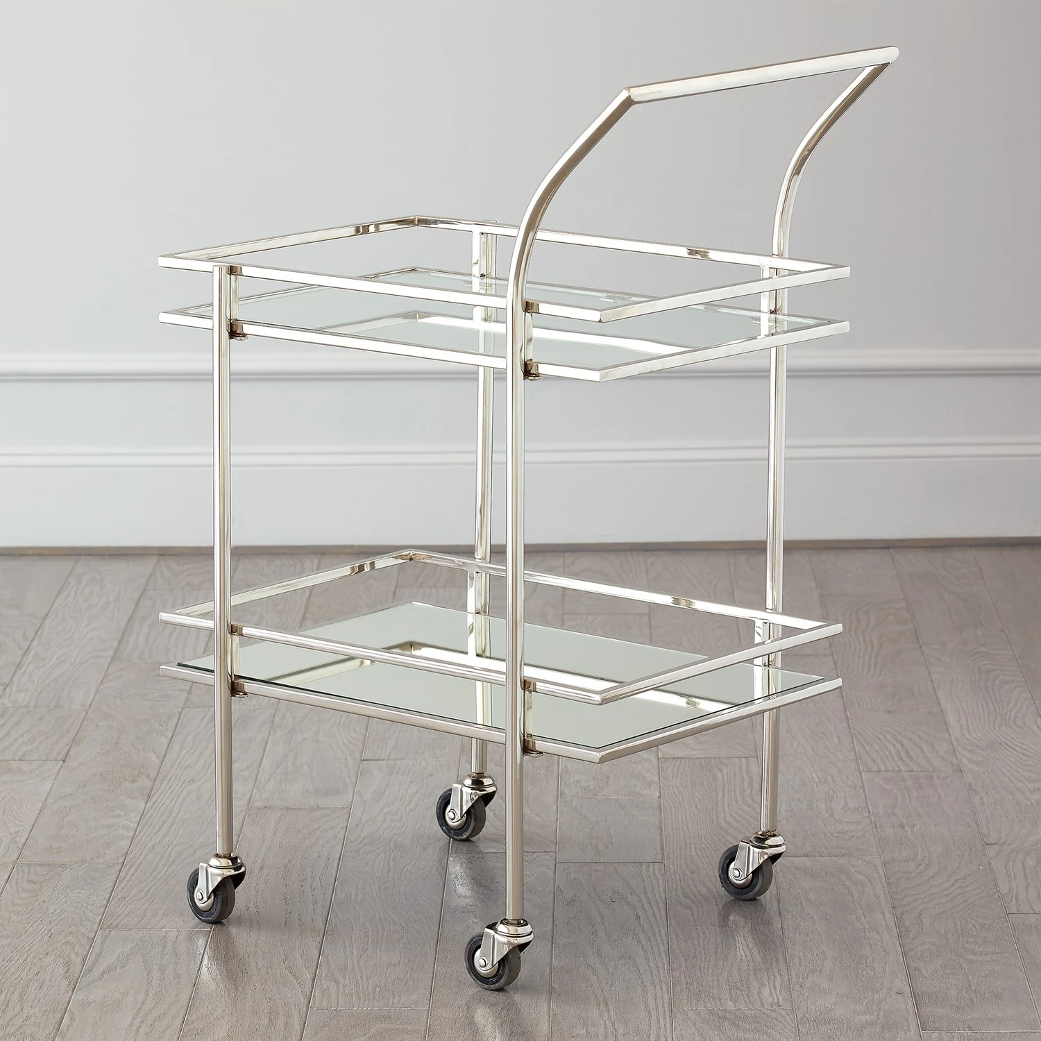 Entertaining is made easy with this versatile Rectangular Mirrored Bar Cart. The bar cart has 2 mirrored shelves which provide a worry free surface to place liquor, mixers, glasses, ice and all the accoutrements necessary for a successful soiree. Finished in polished brass with casters of ease of movement.