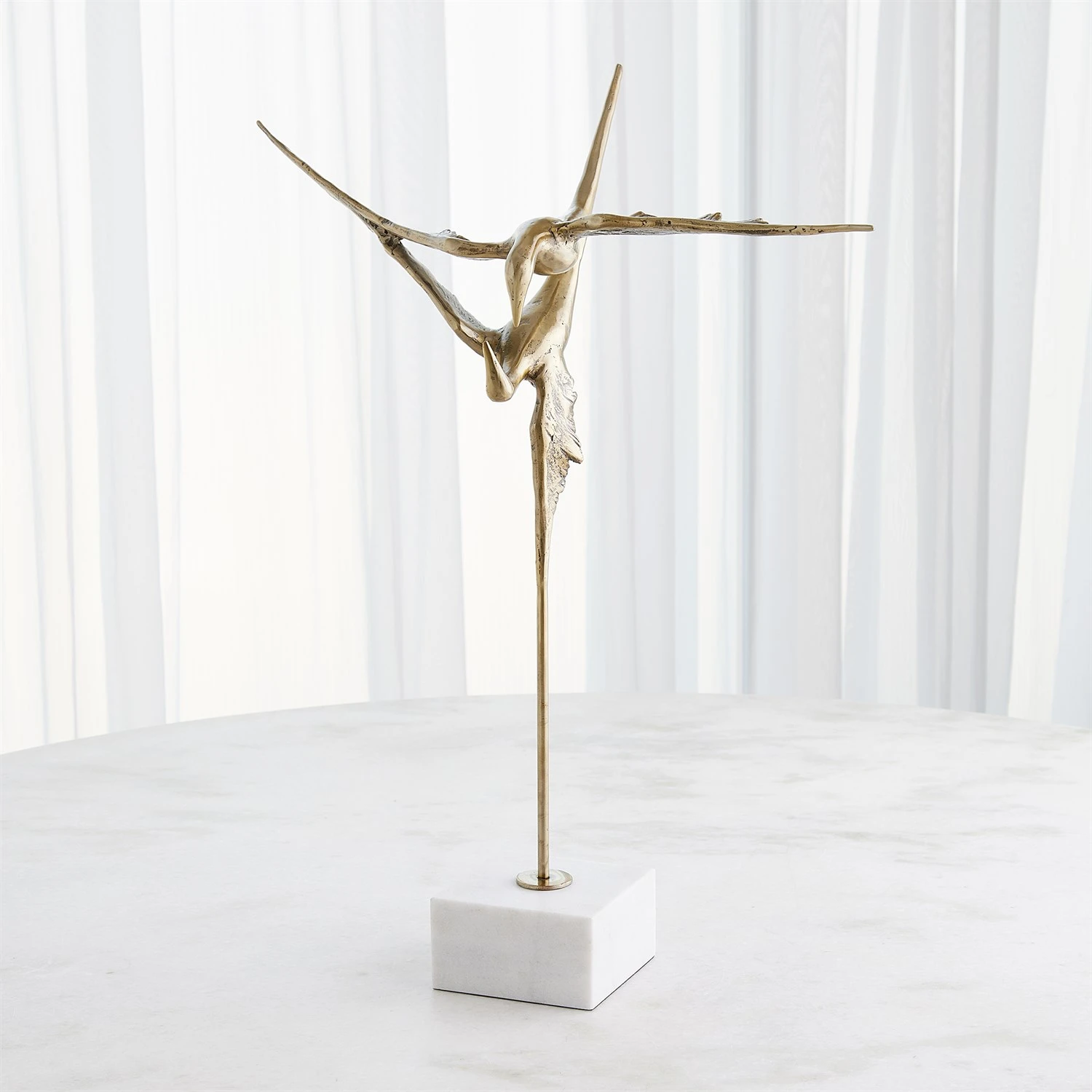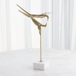 Inspired by the reflection of a bird flying closely over a lake, this sculpture is beautifully handcrafted from cast iron, featuring a faux brass finish elegantly presented on a white marble base.