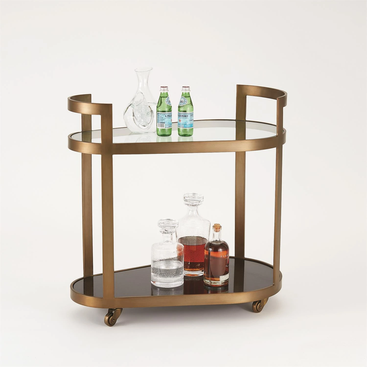 The contemporary Regan Bar cart has a unique ovoid shape and features a solid black granite bottom shelf and clear glass upper shelf. Pivoting casters make for easy mobility. Available in an antique brass or bronze finish.