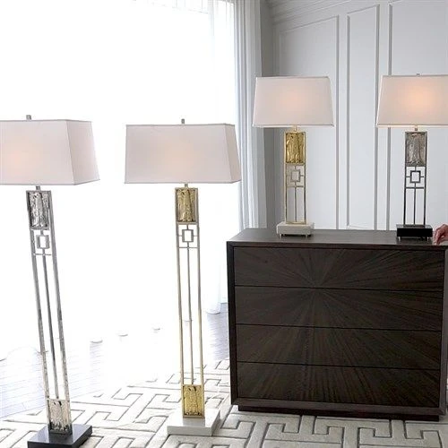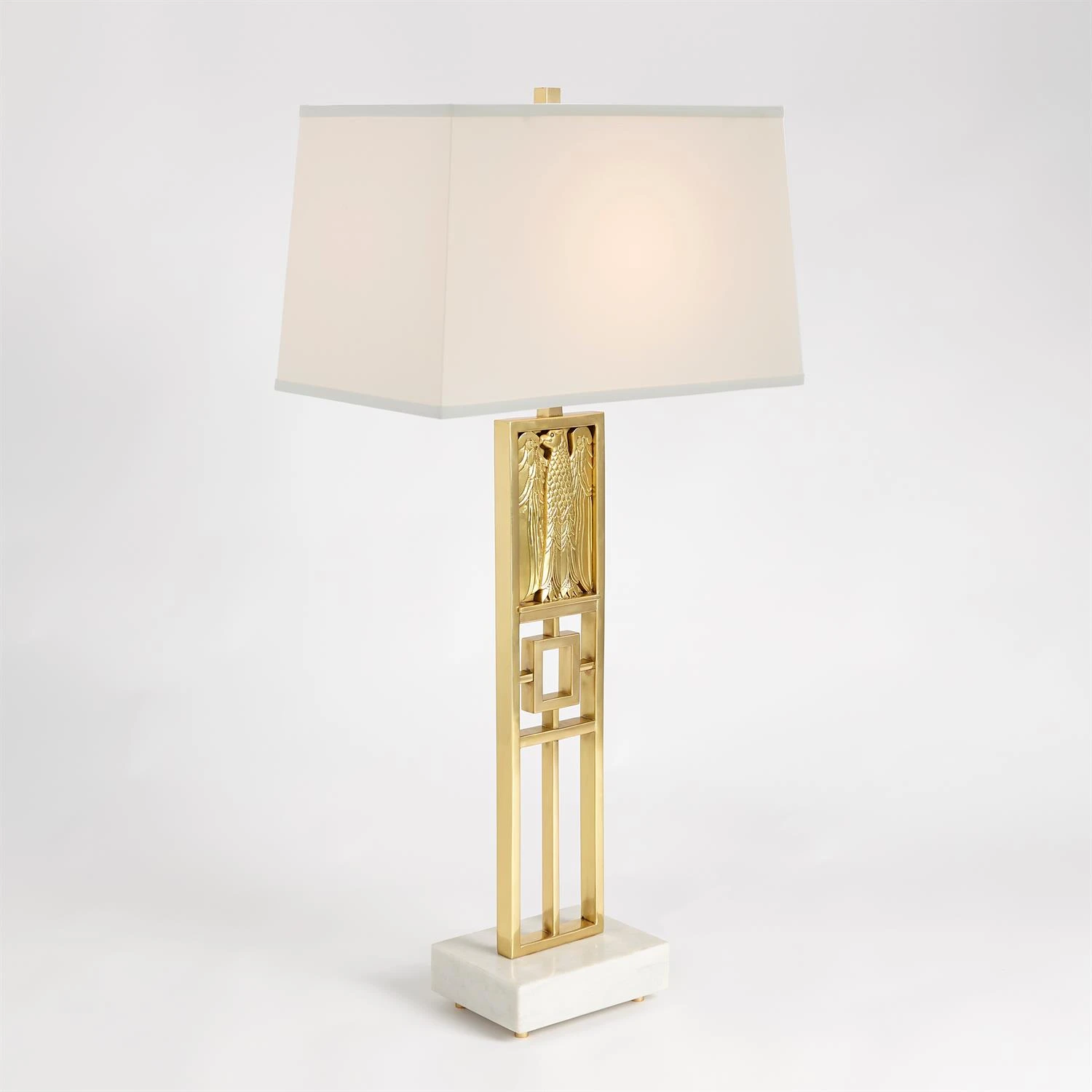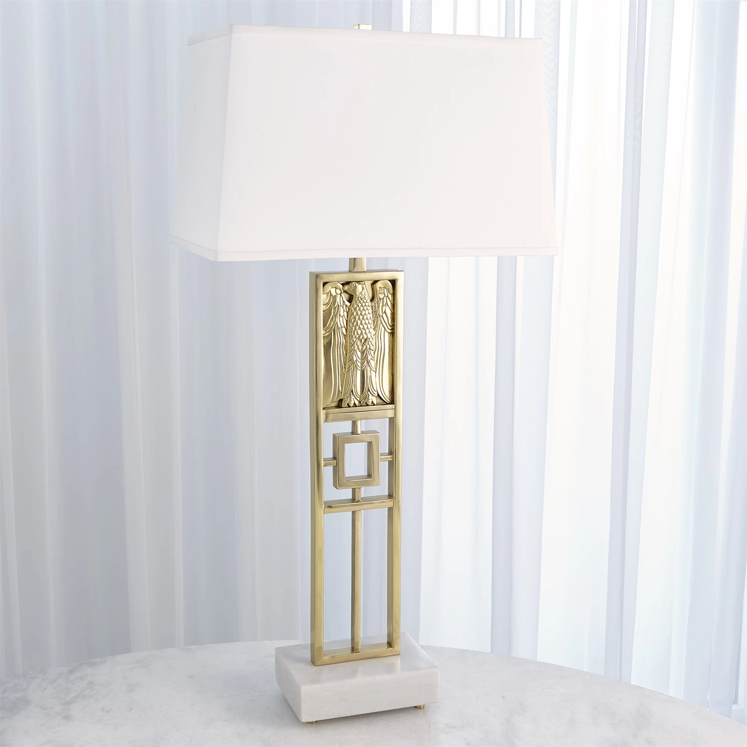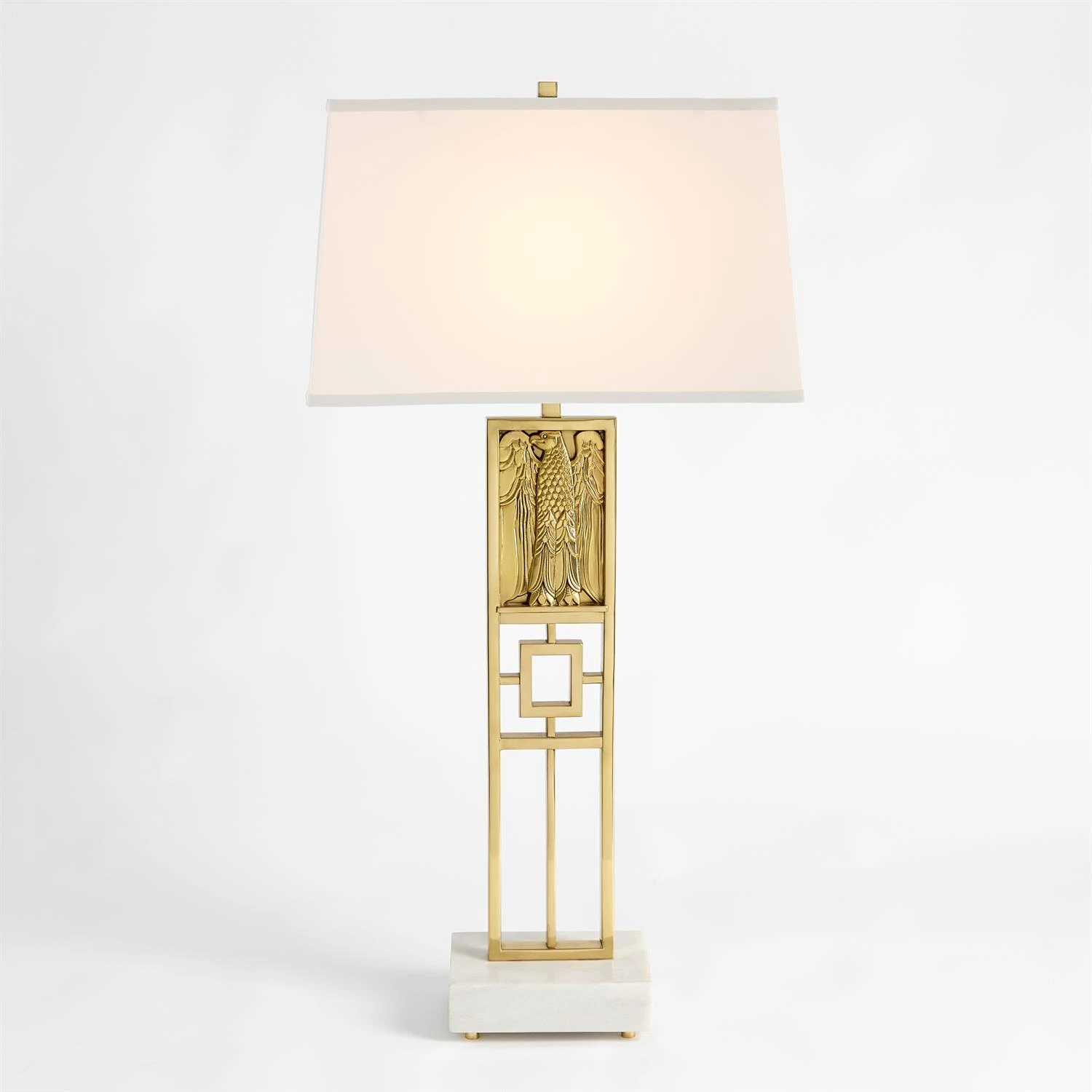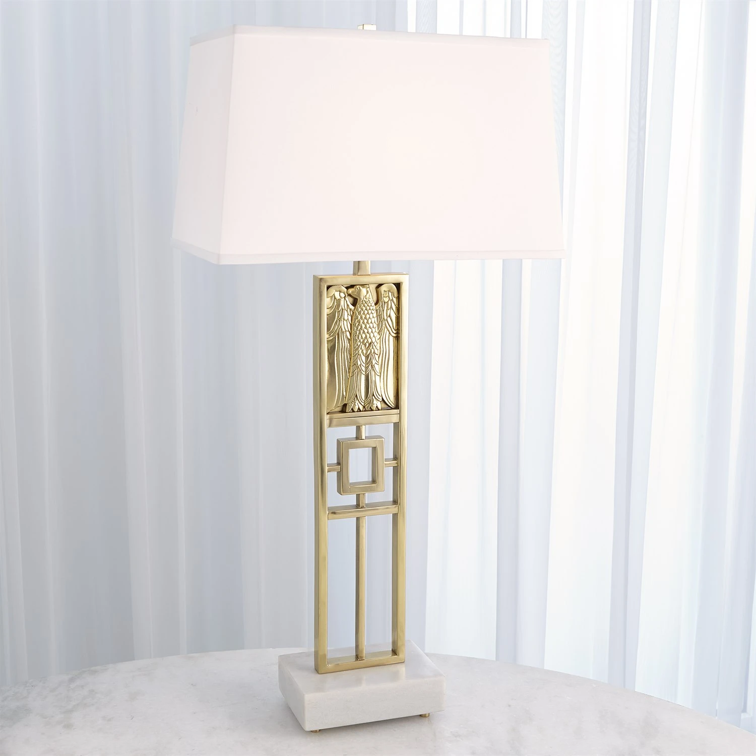 Done in brass with a white marble base, this slender profile lamp features intricate detailing of an eagle. Holds one 60W “A” Bulb.