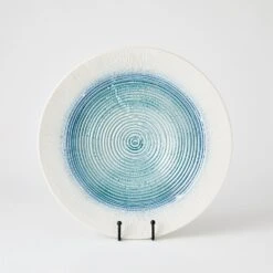 Crafted by Portuguese artisans, the Ribbed Charger is made of slip-molded ceramic with a lamb’s ear and white finish. Each radial line is hand-painted with a reactive glaze creating white-colored highlights shining through blue when fired in a kiln.