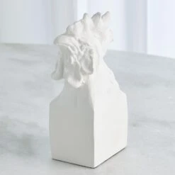 The Arete Collection is renowned for magnificently carved and hand-crafted home furnishings. This exclusive collection for William D Scott consists of nature-inspired accessories. This cast aluminum sculpture is covered in a matte white finish and resembles the head of a rooster resting atop a rectangular base. Felt tabs on the bottom of the sculpture help to protect any surface this piece rests upon.