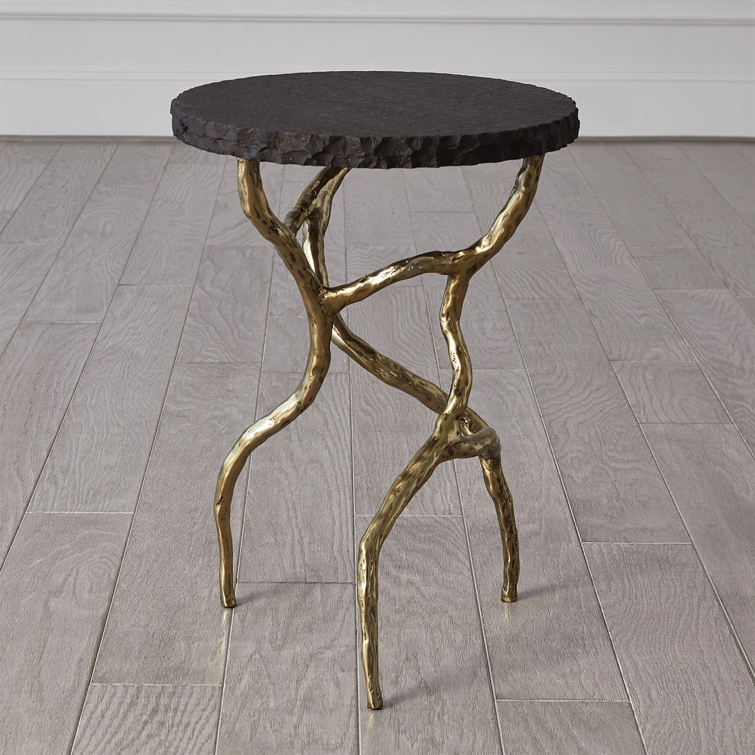 The Root Table is made of sand casted iron with a faux brass finish and honed black marble top.