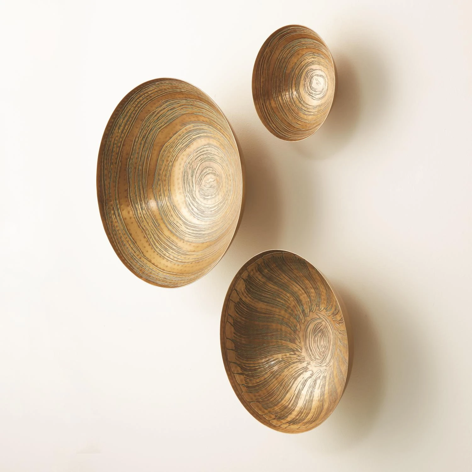 Formed from solid brass sheet, each bowl is put through an acid wash which when finished, leaving the intricate, etched design. Each bowl features a threaded hanging mechanism with wall plates that mount with two screws. This set is also available in an antique nickel finish.