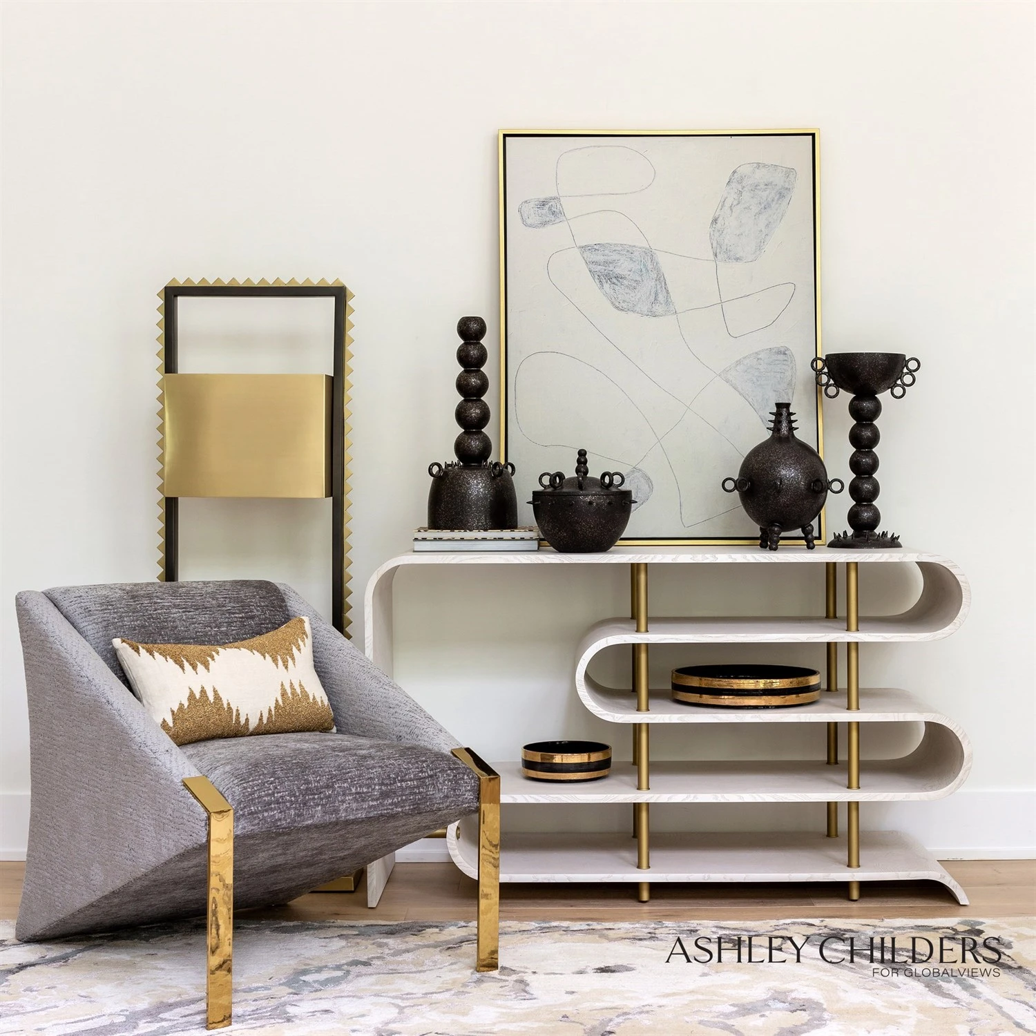 Inspired by abstract forms, Ashley Childers created the Scratch Loops paintings by layering thick paints with a palatte knife application. Framed in our gold floater frame, the pieces become a study in textural, modern simplicity.