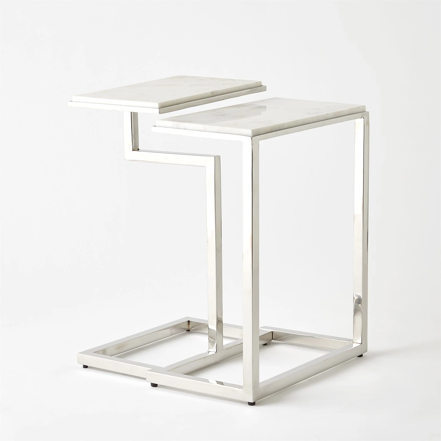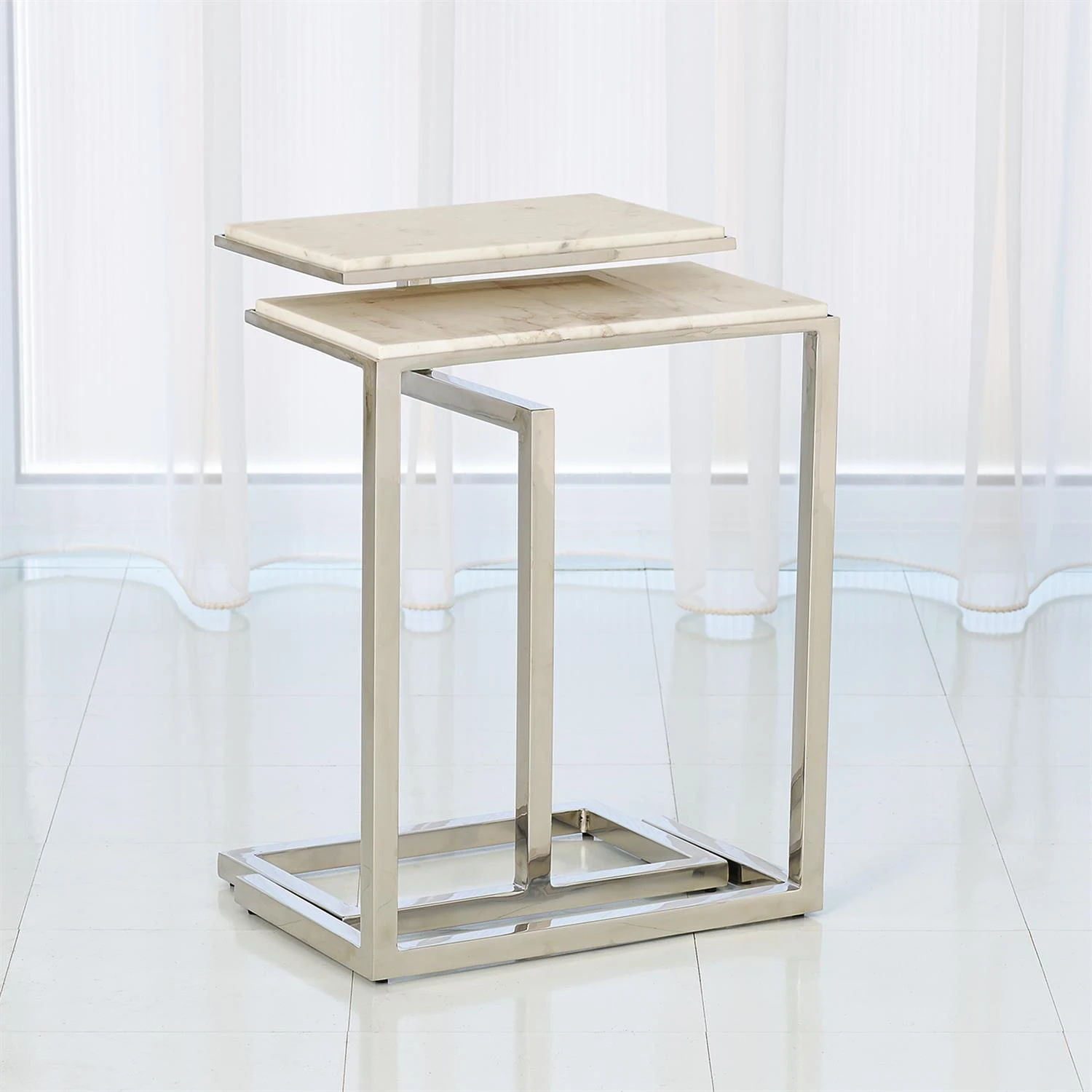 This wonderful nesting table set not only stylish, it’s also multifunctional! Each table can function alone or together. They stack nicely together to save space. This amazing table set is constructed from stainless steel with a nickel finish and have white marble tops.
