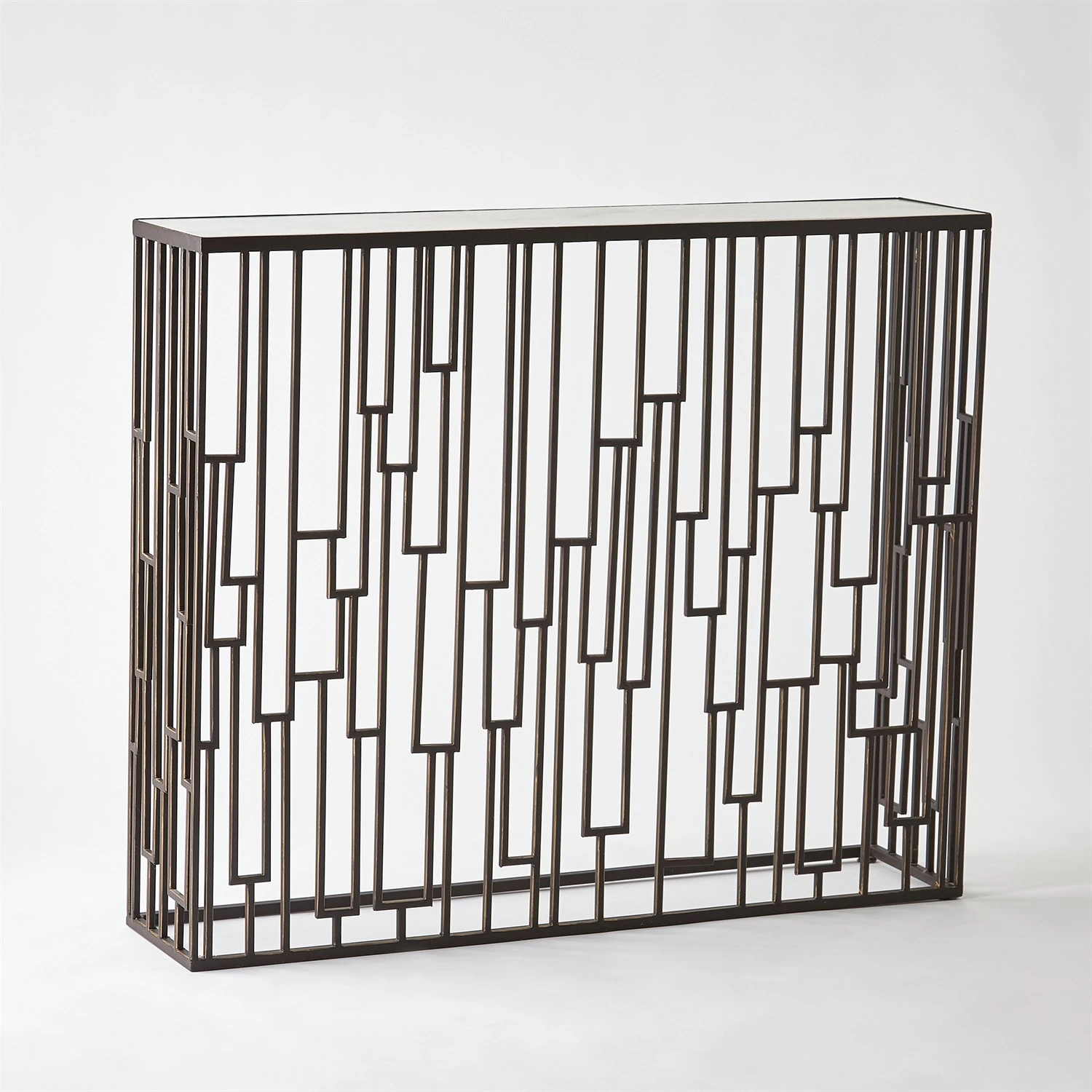 Layered bronze finished rectangles create the base of our Shingle Hall Console. The console is an abstract interpretation of the way shingles lay on a roof. The rich bronze finish is highlighted by a gold rub on the edges creating dimension. A white marble top sits snugly in the frame.
