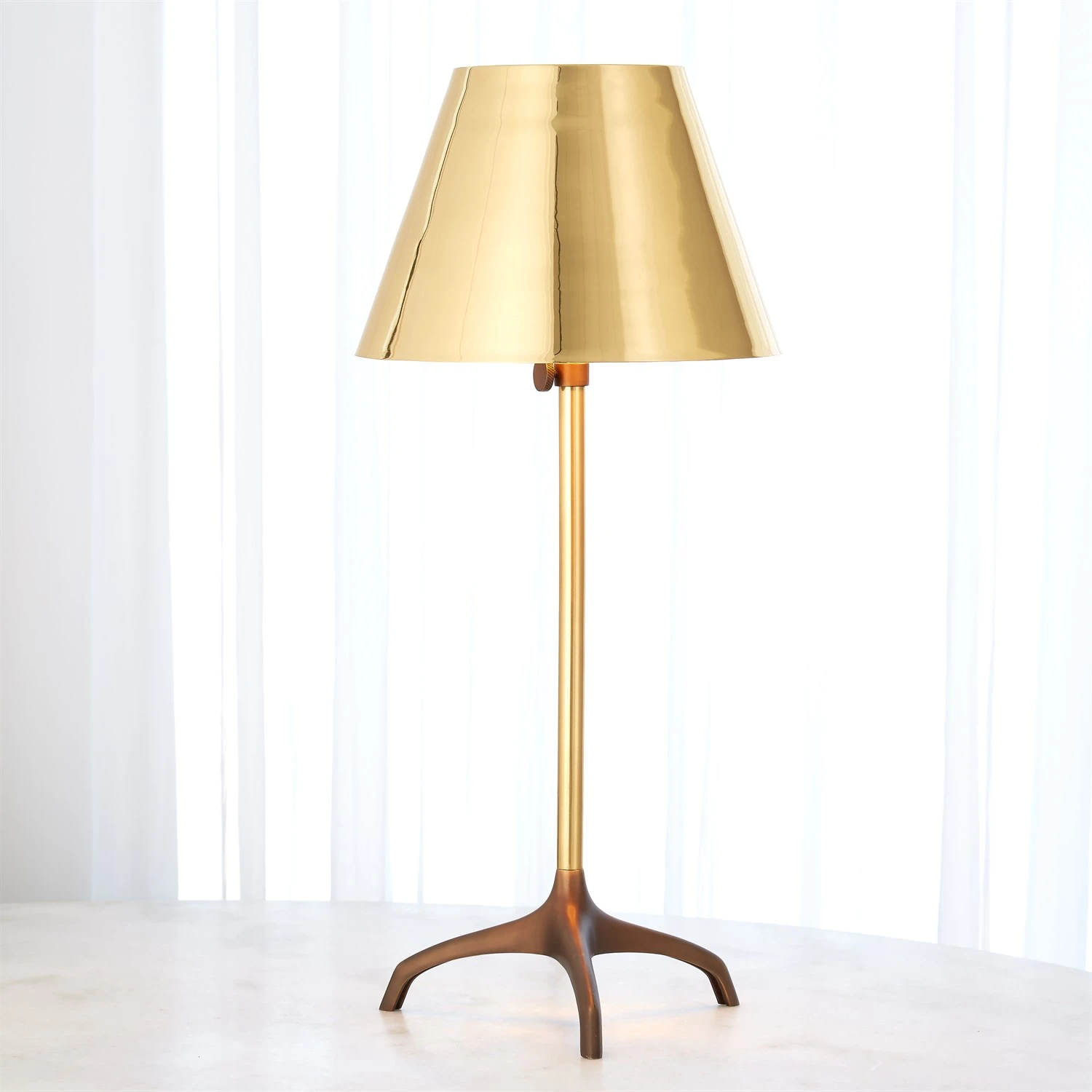 Our polished metal tripod table lamp will illuminate your room or home office with elegance and simplicity. The matching all metal table shade sets this floor lamp apart from all the rest. It has a telescopic body that allows for adjustment to the height. This is truly a versatile piece.