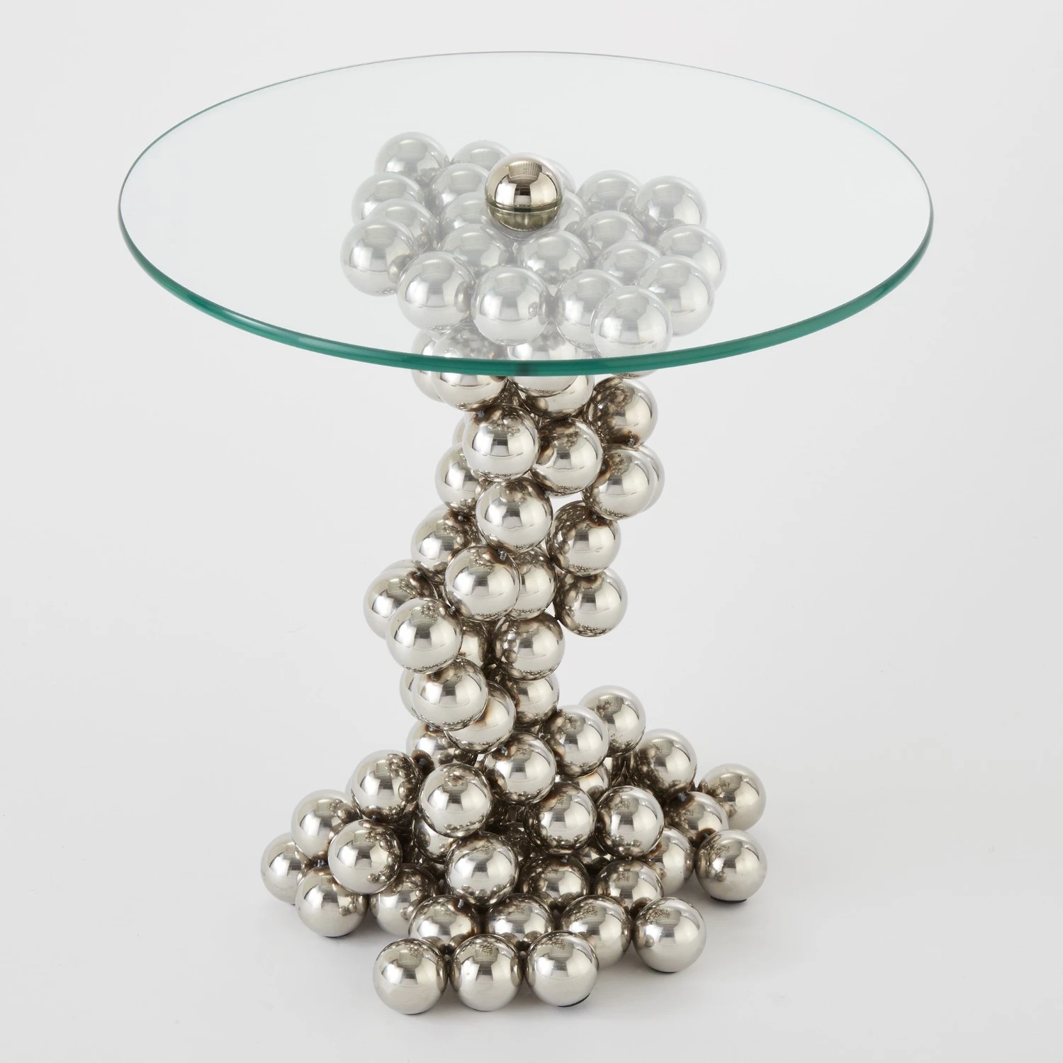 An urban sculpture of stacked chrome plated spheres perfectly suspends a floating glass top, creating a table for all occasions. Glass is tempered.