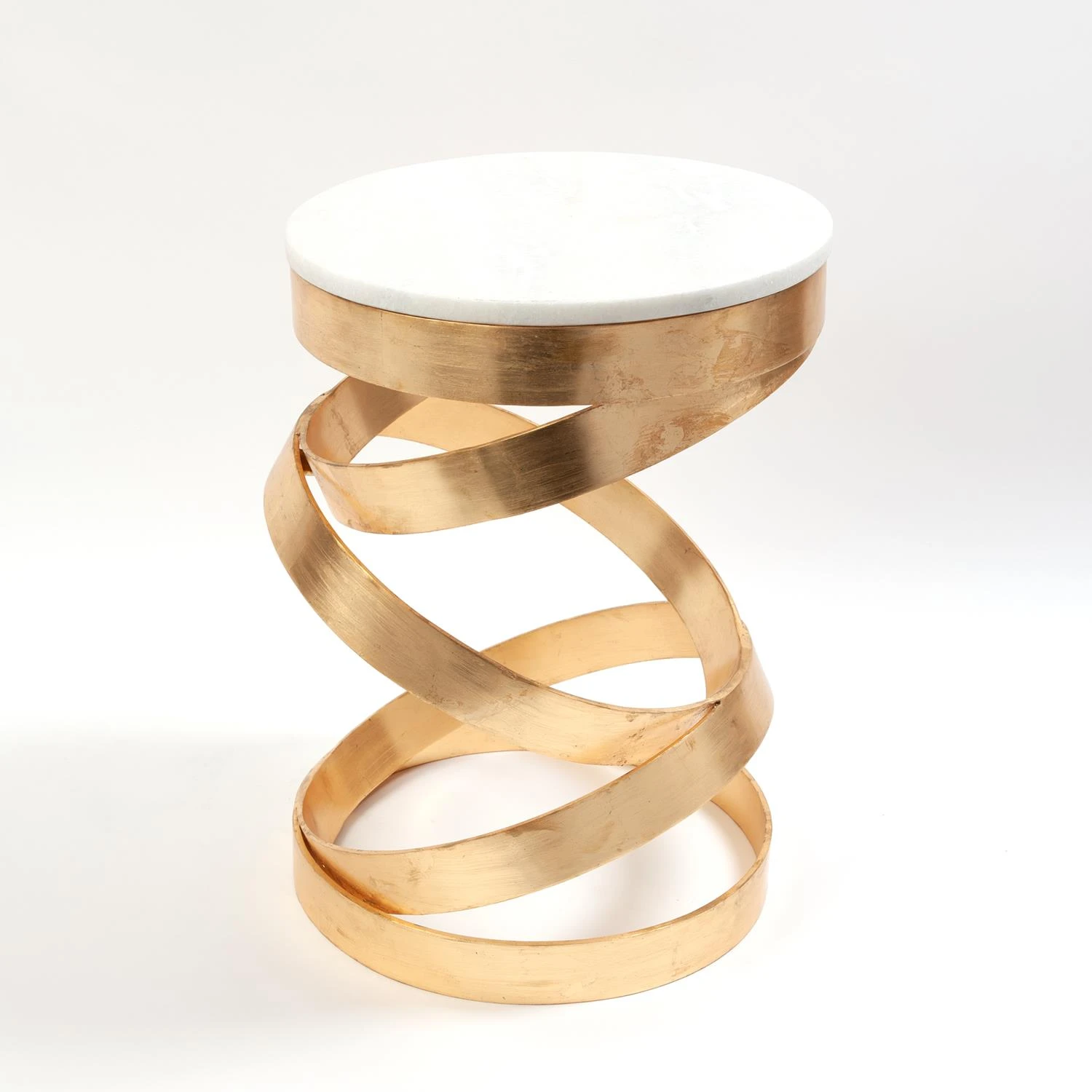 Our Spiral Table features an iron frame that mimics a strategically placed stack of rings, finished with real gold leafing, and a solid white marble top.