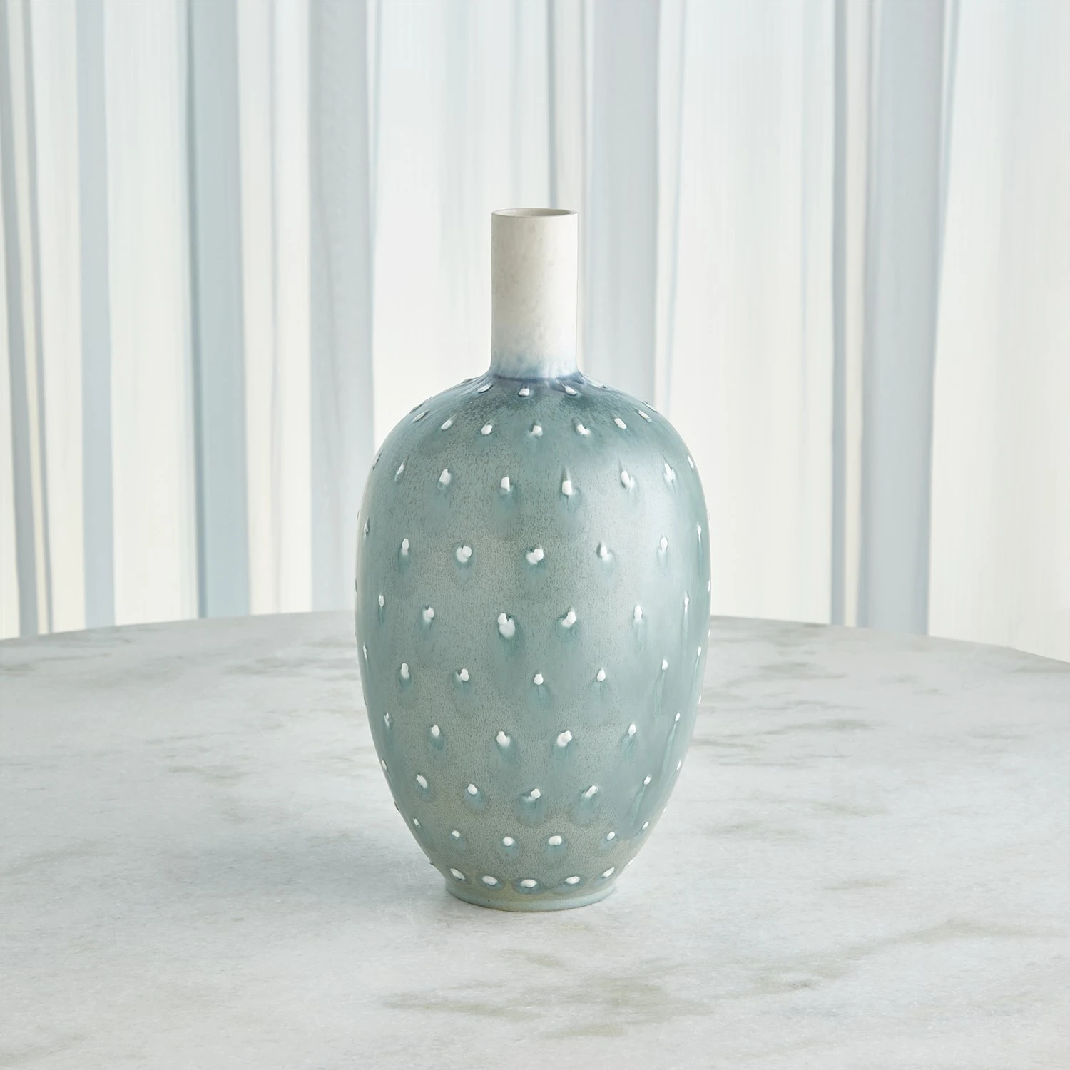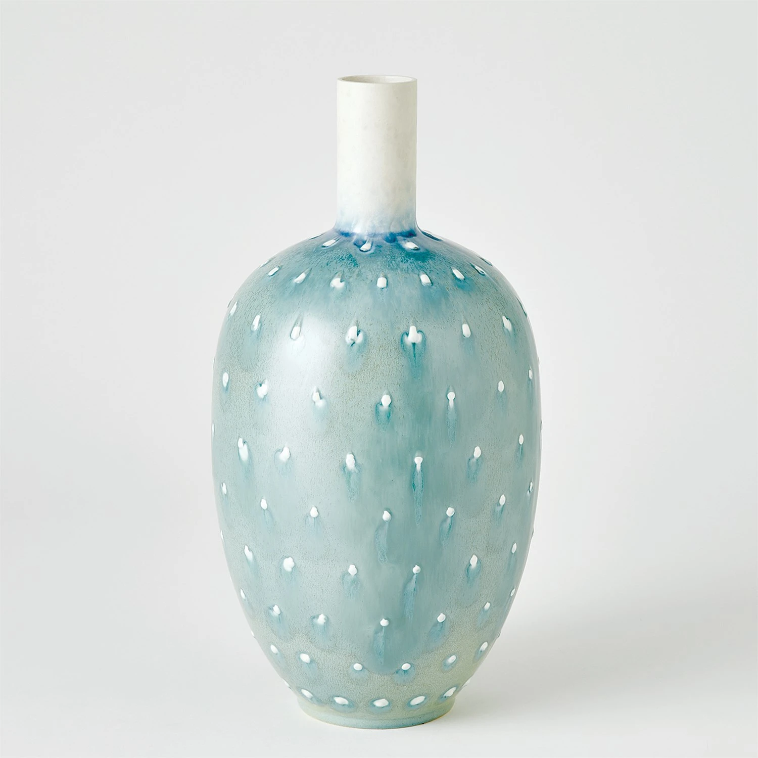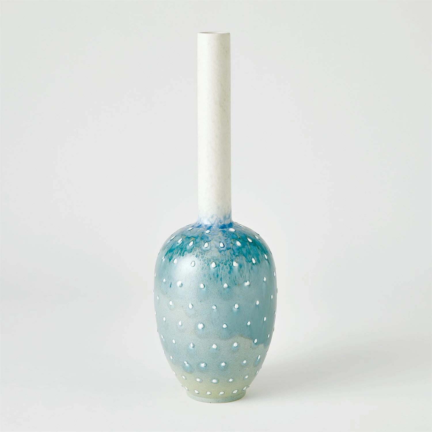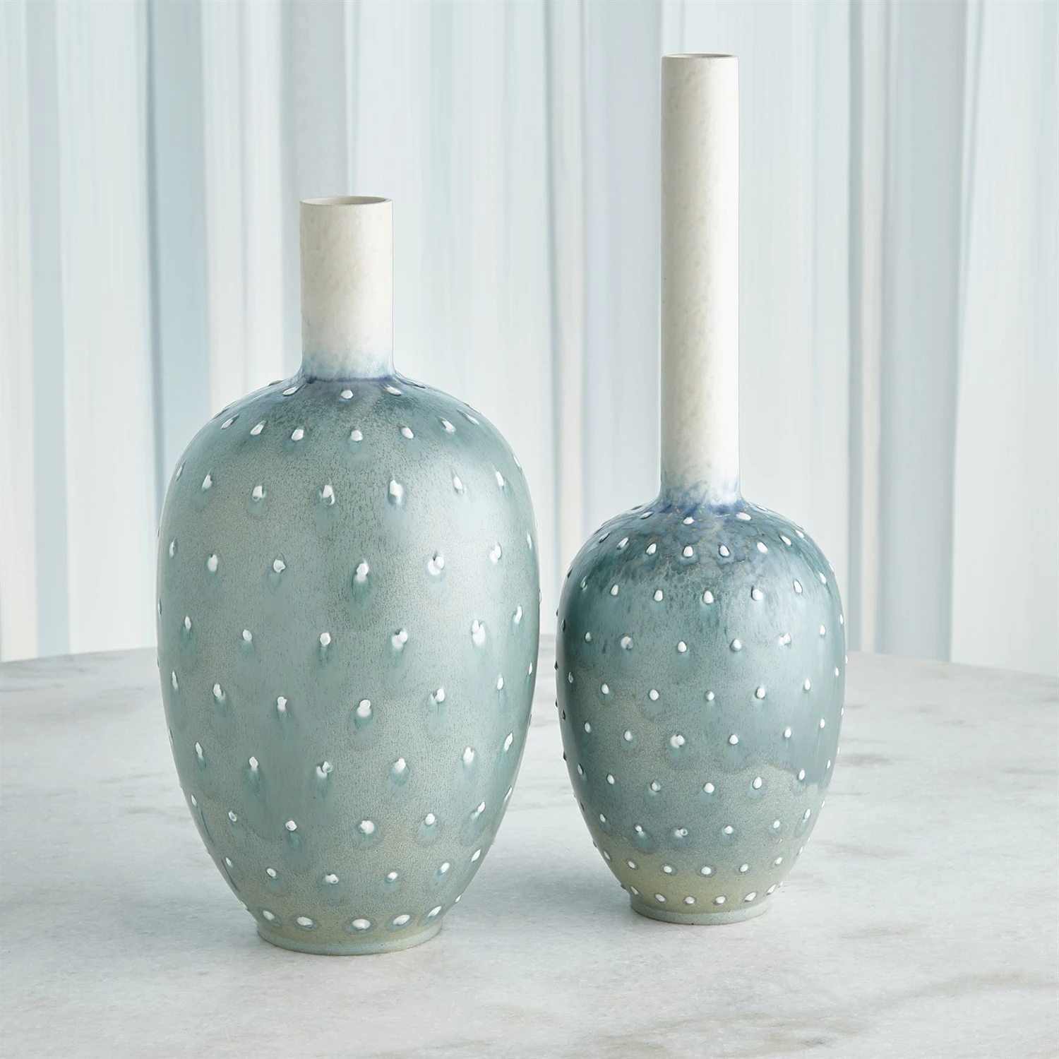 The Spotted Vases are slip-cast Portuguese ceramics with a lamb’s ear reactive glaze finish and hand-applied dot details.