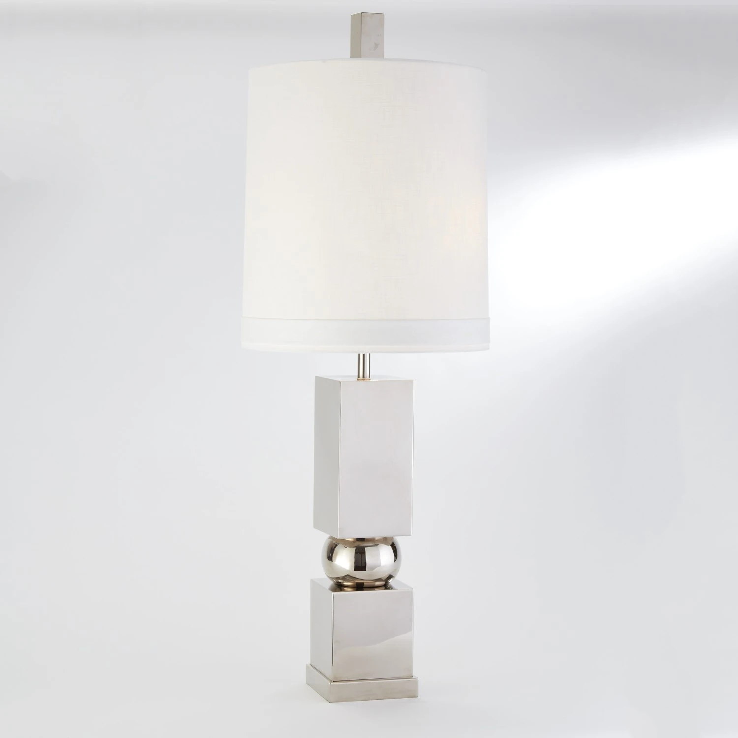 Two nickel plated brass squared pillars hold an orb in place forming the base of our Squeeze Lamp. Topped with a white linen shade and squared finial, the lamp glows with modernity.