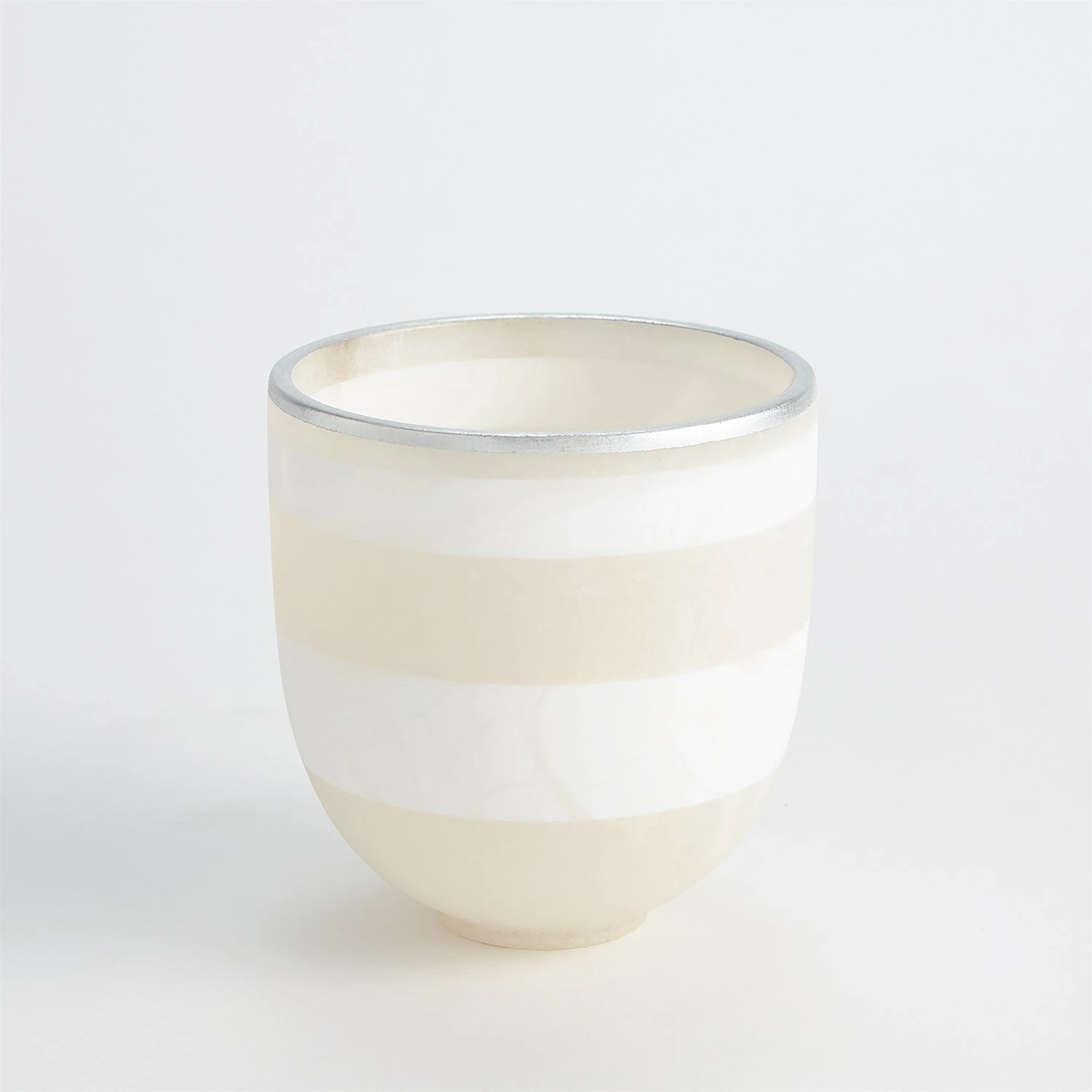The Striped Alabaster Bowls are made of alternating blocks of Italian alabaster with silver leaf painted detail. As alabaster is a natural product, please be aware that there will always be variations in veining and color.